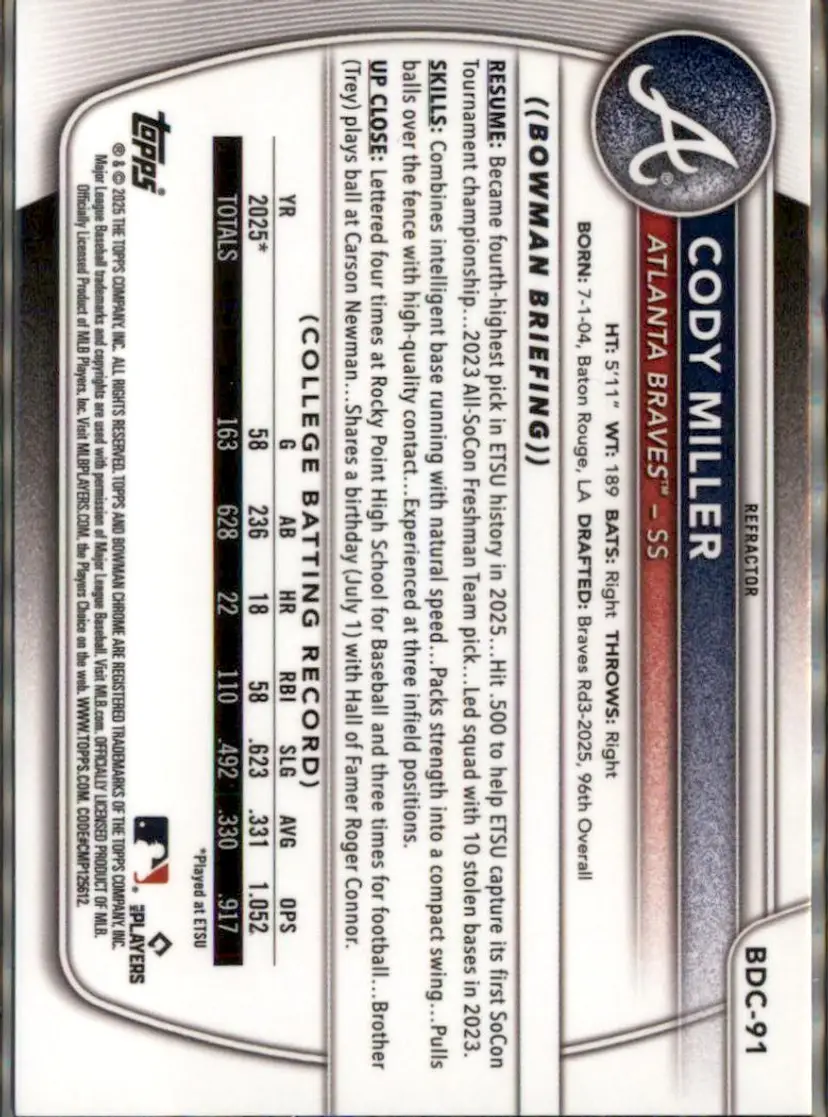 2025 Bowman Draft #BDC-91 Cody Miller Chrome Refractor - (138) - Atlanta Braves