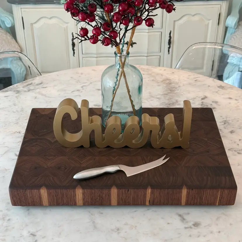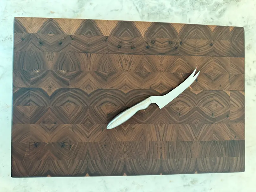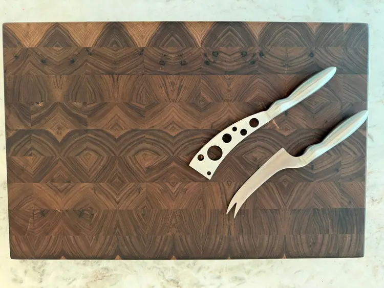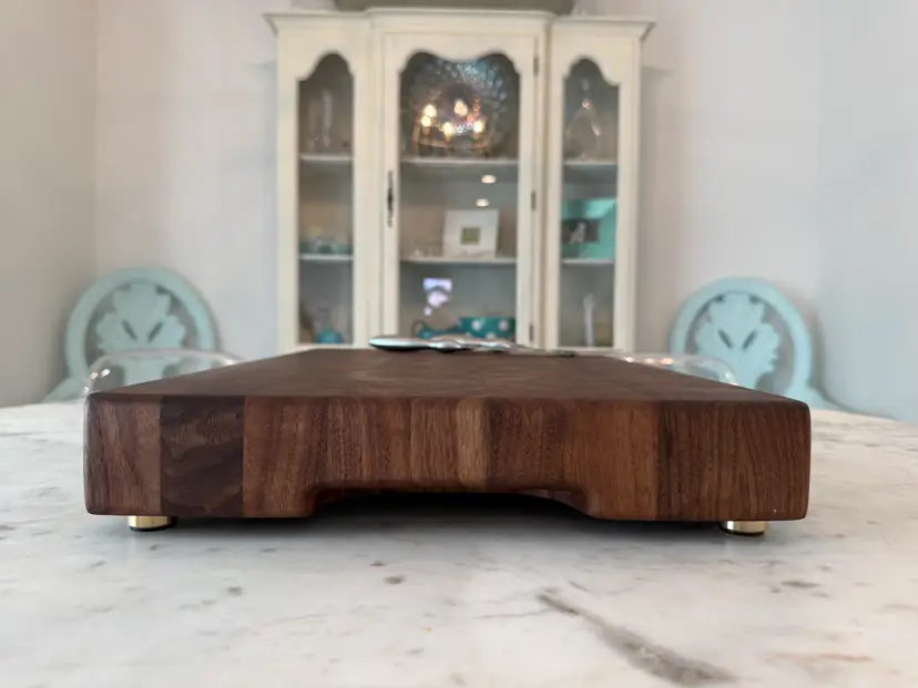 Enhance your kitchen with this stunning end grain walnut cutting board. Perfect for both everyday use and special occasions. All boards regardless of size have a minimum thickness of 2-1/2" with integrated lifting handles and brass feet with silicon inserts to ensure an heirloom quality piece that will last generations. There can be some slight variation in size (+/- 1/2") due to the custom nature of the piece. Pictured is 21"x15"