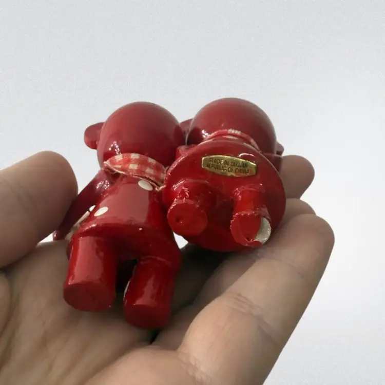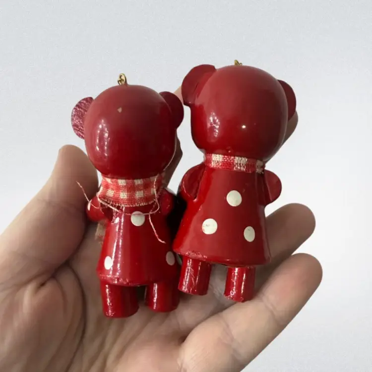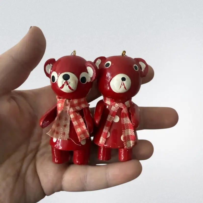Pair of wooden bear ornaments- made in Taiwan. Good vintage condition- some slight hidden paint chipping on one bears foot and general makers imperfections.