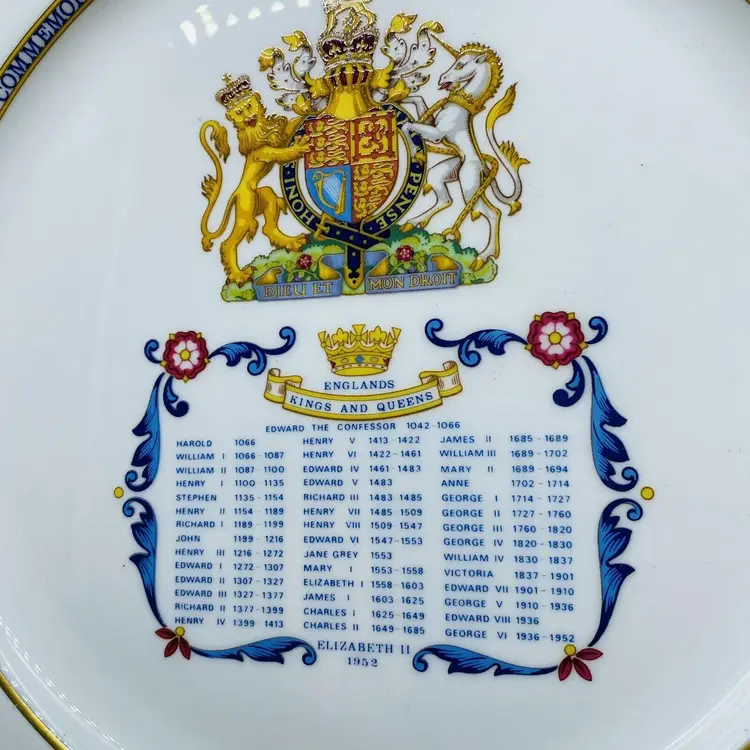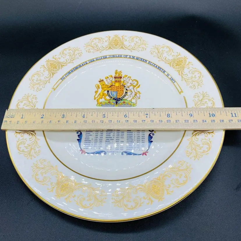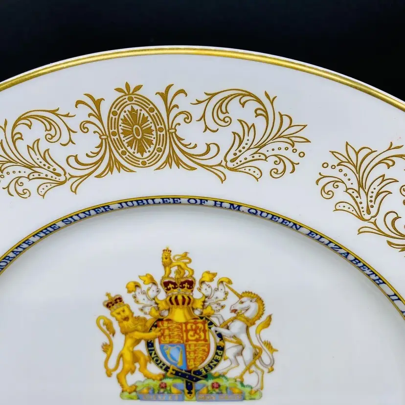 Amazing quality of this plate issued for the Jubilee of Queen Elizabeth II in 1977. It features an embossed gold patterned rim, the Royal Crest and Crown as well as the Royal Lineage from King Harold 1066 until the Coronation of Her Majesty in 1953. A much needed piece for any collector or a personal tribute and memory of the late Queen