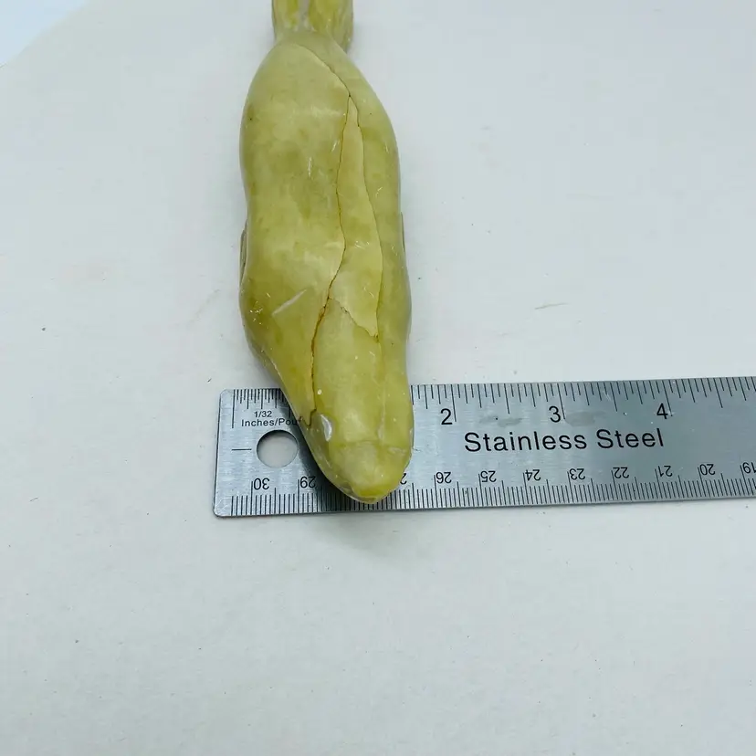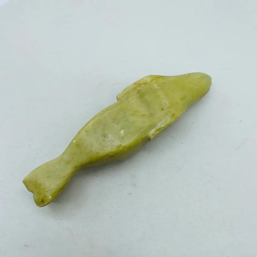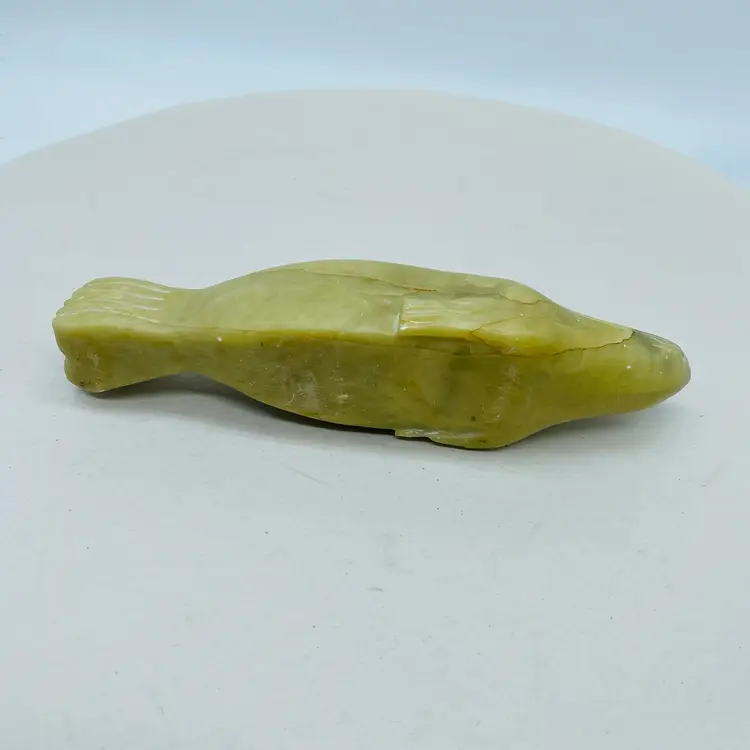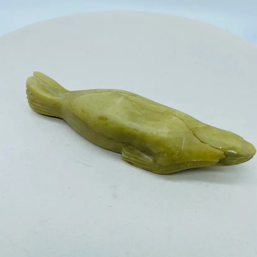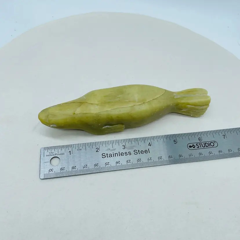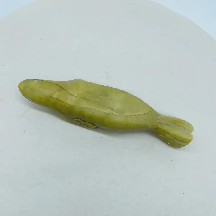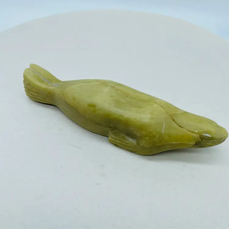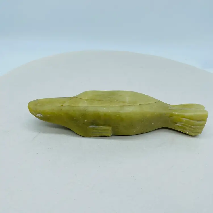Canadian Indigenous Soapstone Carving depicting a Fish, Whale, or Sea Creature, measuring 6.5 inches in size. This handmade piece showcases the talent and artistry of Canadian Aboriginal culture. Originating from Canada, this collectible item is a unique and authentic representation of Indigenous craftsmanship. With an unknown tribal affiliation and no available ownership history, this carving carries a sense of mystery and cultural significance. Perfect for collectors or those seeking to appreciate Canadian Aboriginal art.