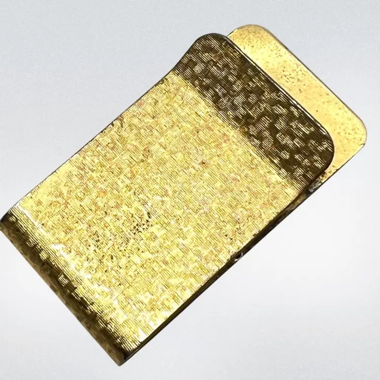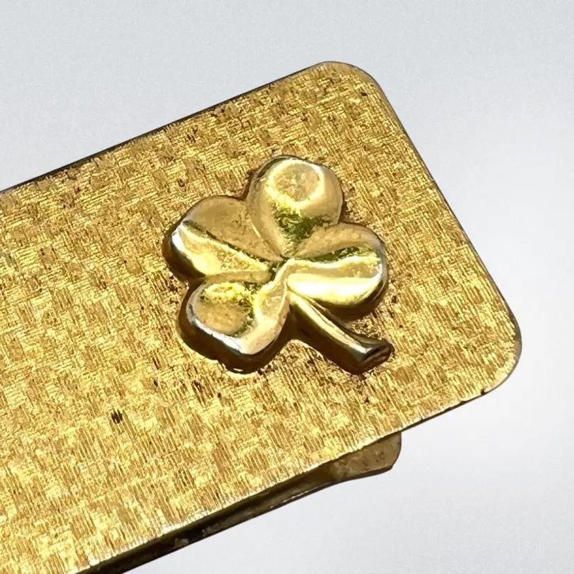 Gold Tone Money Clip Lucky 4 Leaf Clover design on top Not marked 2” x 1” Good condition on exterior; gold tone loss on interior (see last photo)