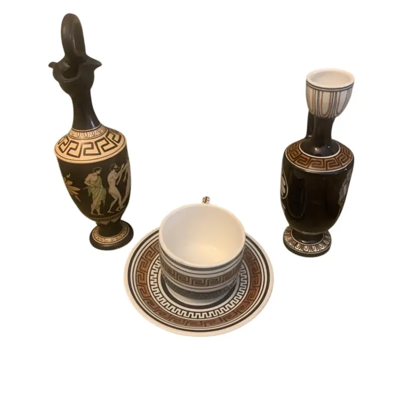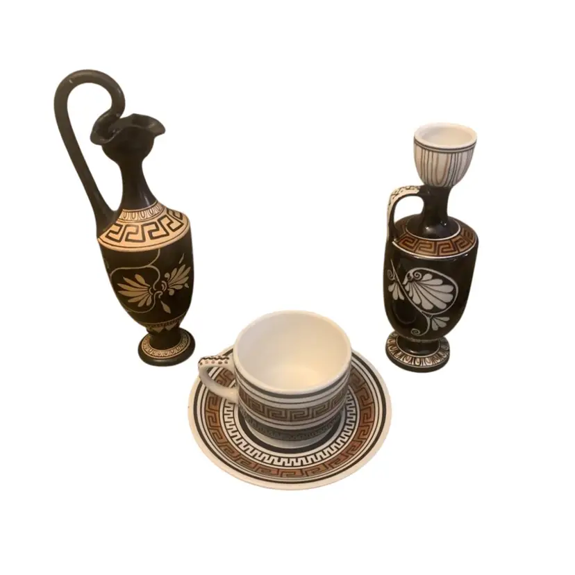 Crack in handle of taller pitcher shown in pictures, no other damage. Taller pitcher 3 X 10, other pitcher 3 X 8 1/4, cup 4 1/2 X 3 1/2 X 2 5/8, saucer 6 1/4 X 3/4 inches.