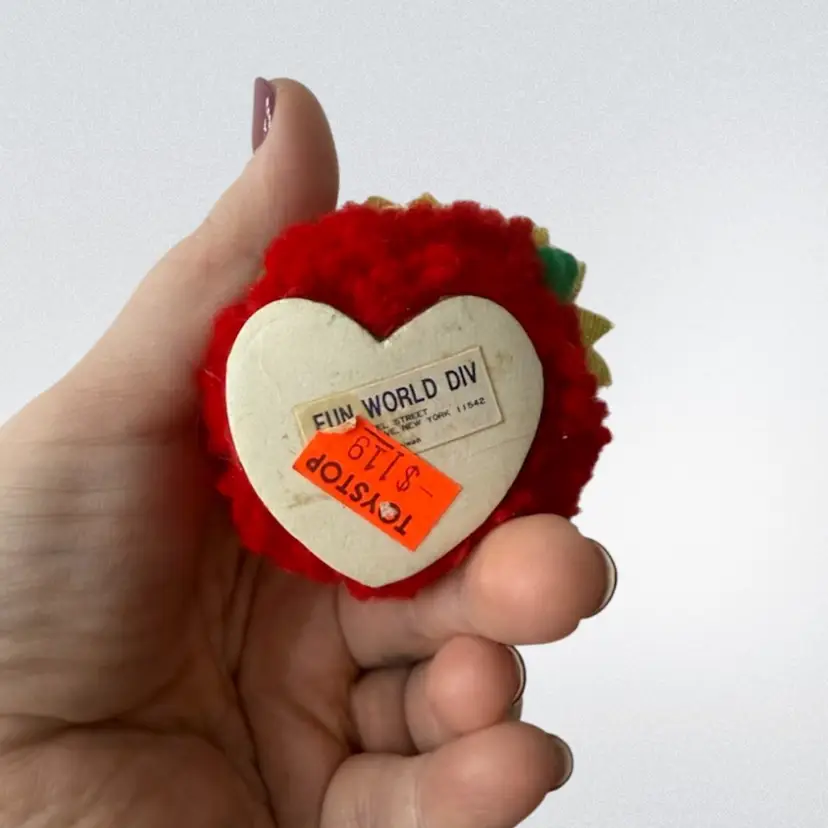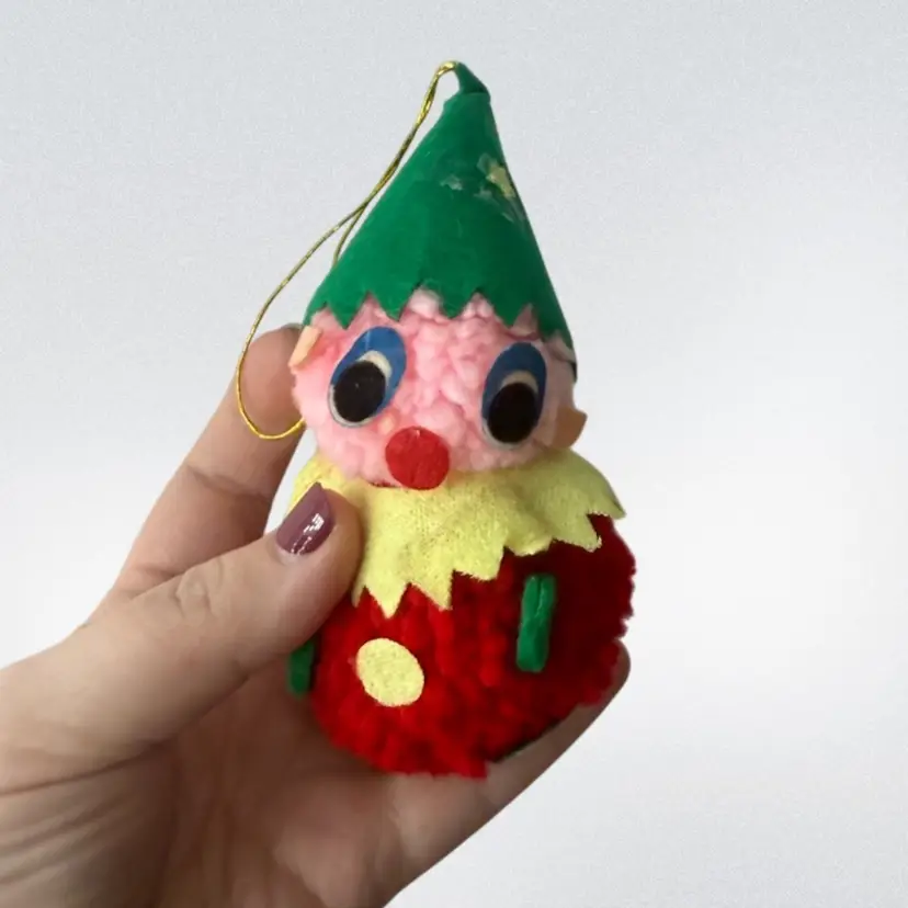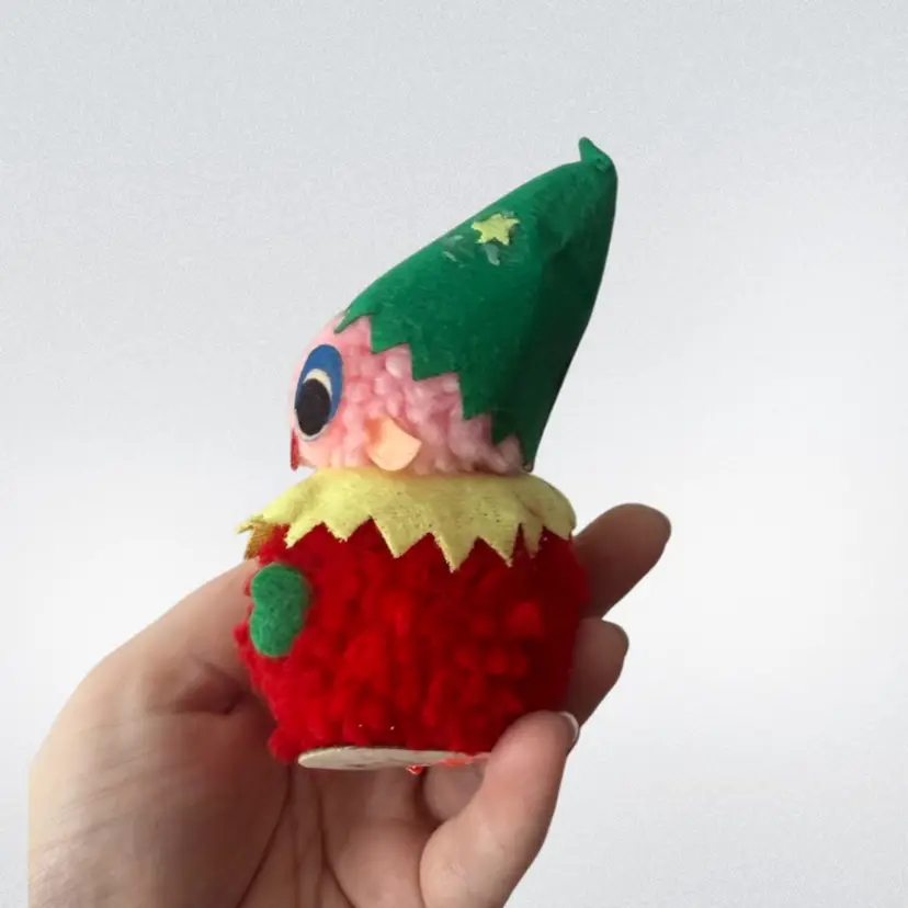 About 4.25in tall, made of Pom Pom’s and felt. Some vintage wear including glue spots and discoloration.