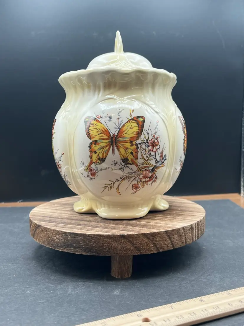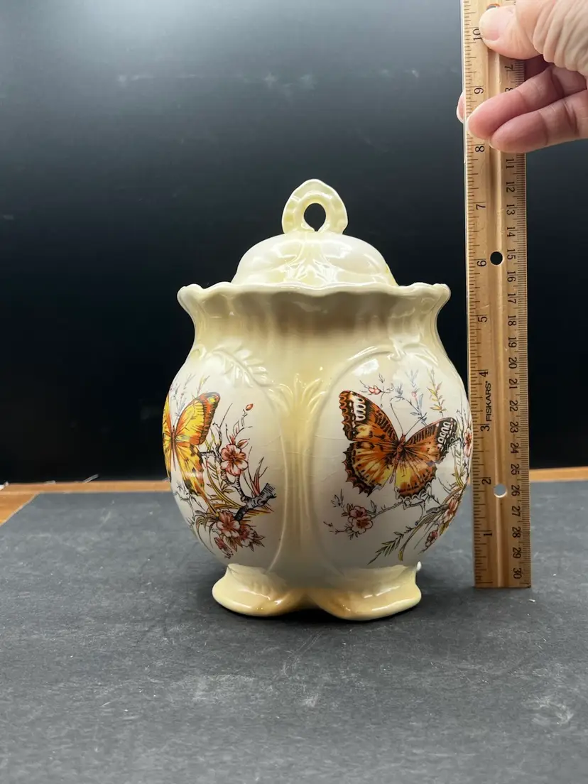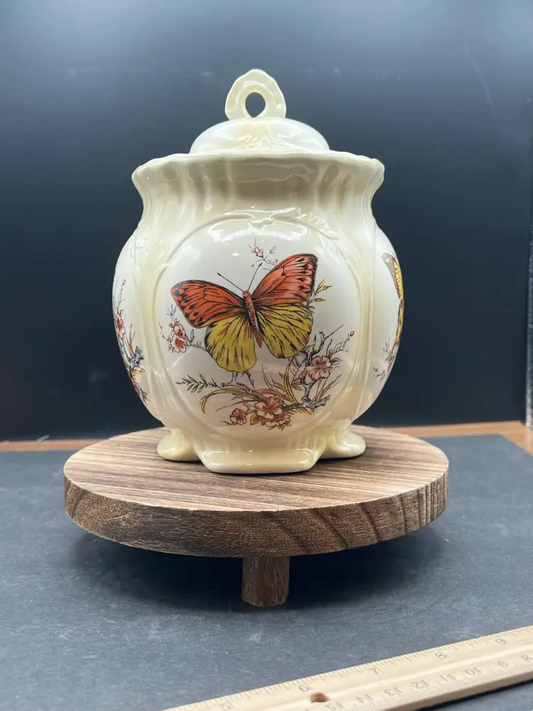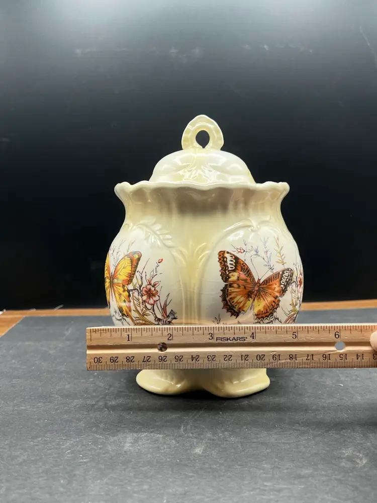 Vintage Hobbyist Biscuits Jar With Lid, 4 Sided Butterfly Motif Creamy yellow In good vintage condition Basket no chips or cracks, but is crazing. 7 1/2” tall x 5 1/2” in diameter Marked on bottom KS ‘82