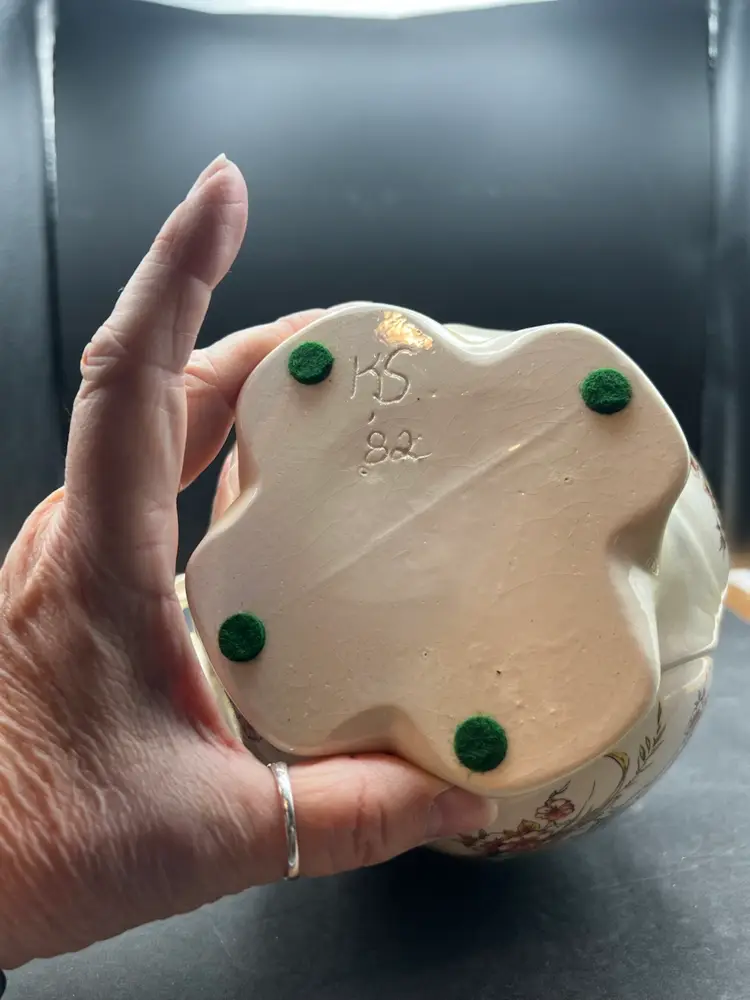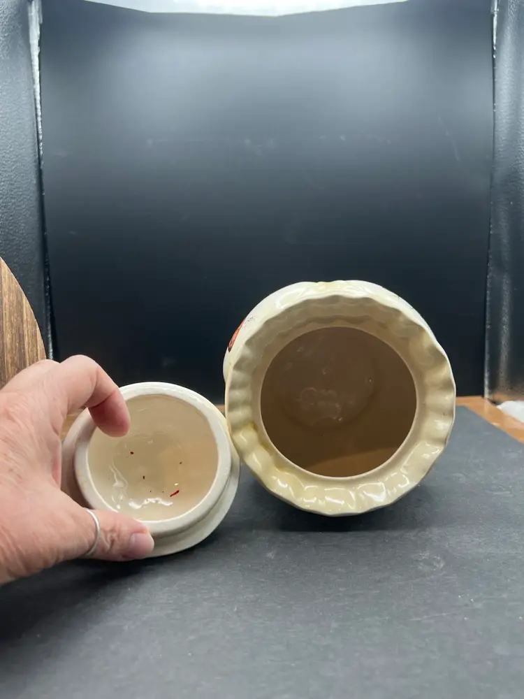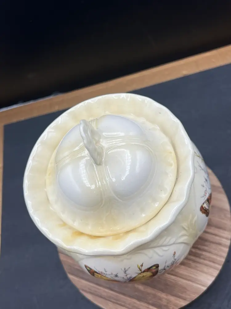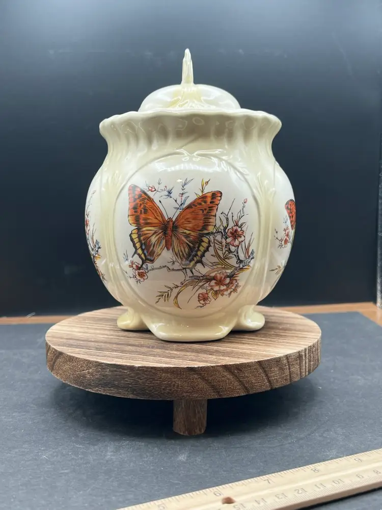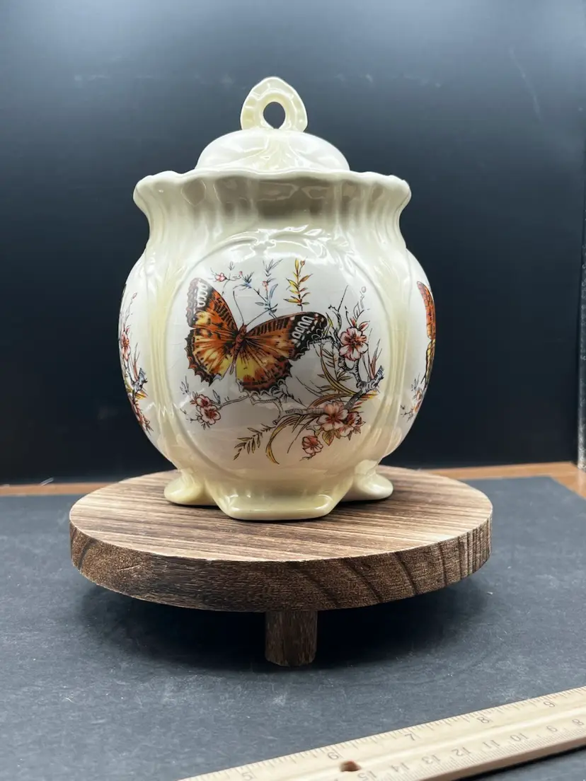 Vintage Hobbyist Biscuits Jar With Lid, 4 Sided Butterfly Motif Creamy yellow In good vintage condition Basket no chips or cracks, but is crazing. 7 1/2” tall x 5 1/2” in diameter Marked on bottom KS ‘82
