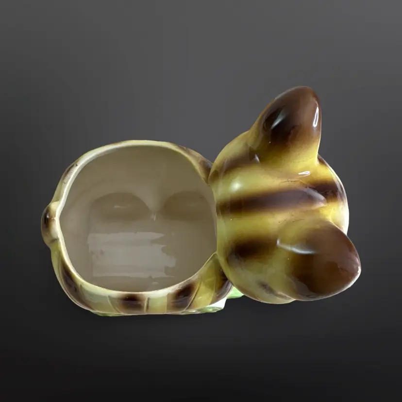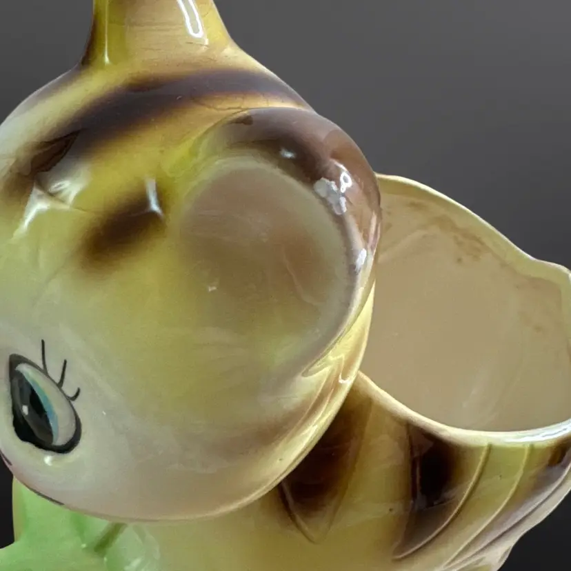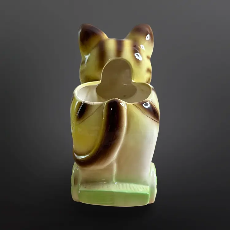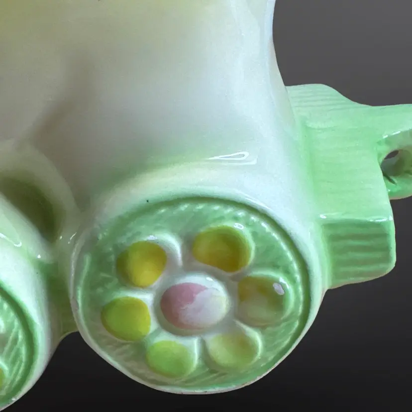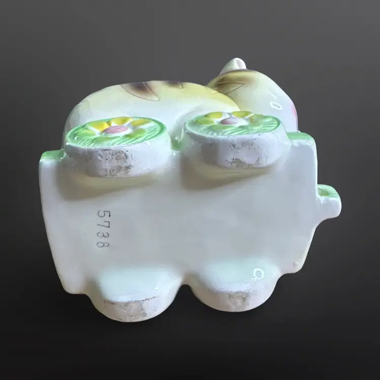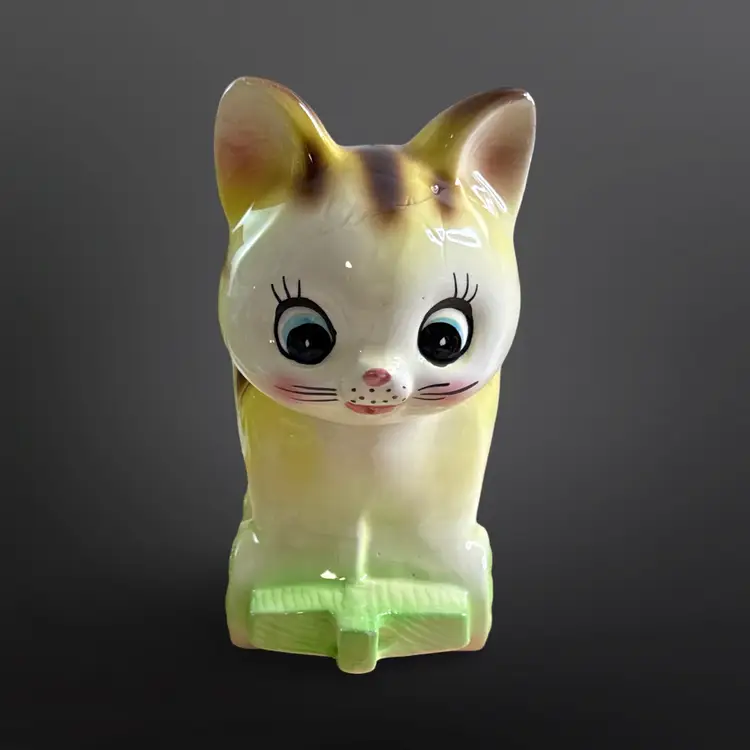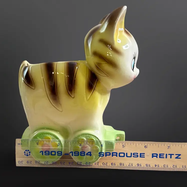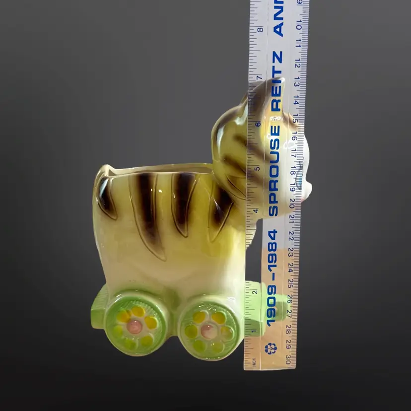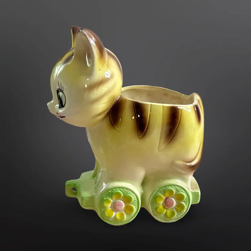 Super cute vintage cat on railcar planter with rosy cheeks and great eyelashes. There are a few paint chips, on one ear and on one wheel, but no cracks or major damage. Measures approximately 6” W x 7” H