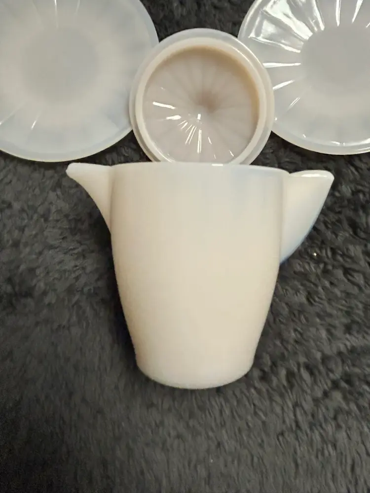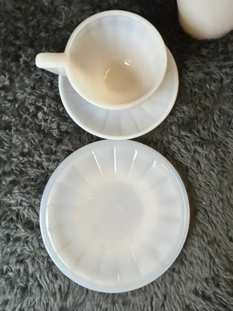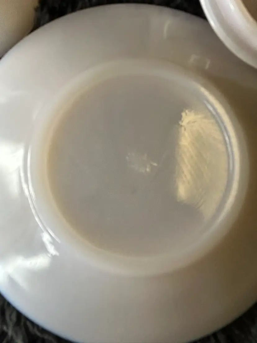 This is a Akro Agate children’s dish set. It was produced from the 1930’s-1950’s in Clarksburg West Virginia. This particular set is made of Platonite, a translucent fired -on glass coating on a milk glass base. Blush pink in an Art Deco style. The sets were produced as part of the company’s Play Time line mimicking adult depression era glassware.