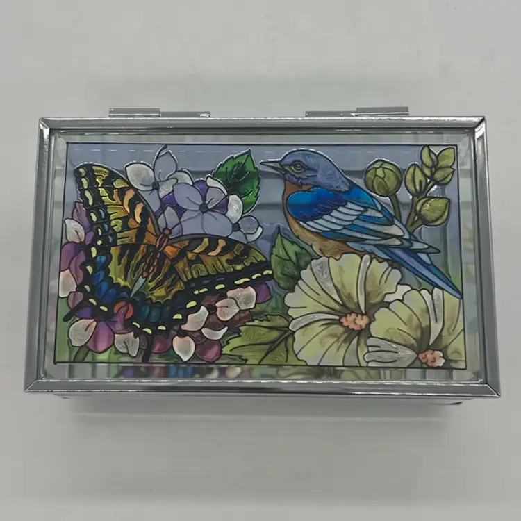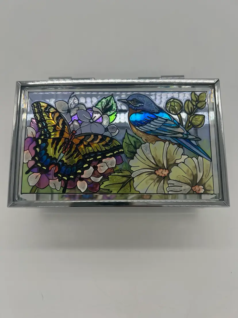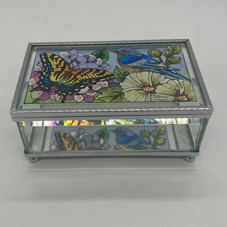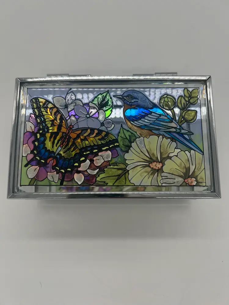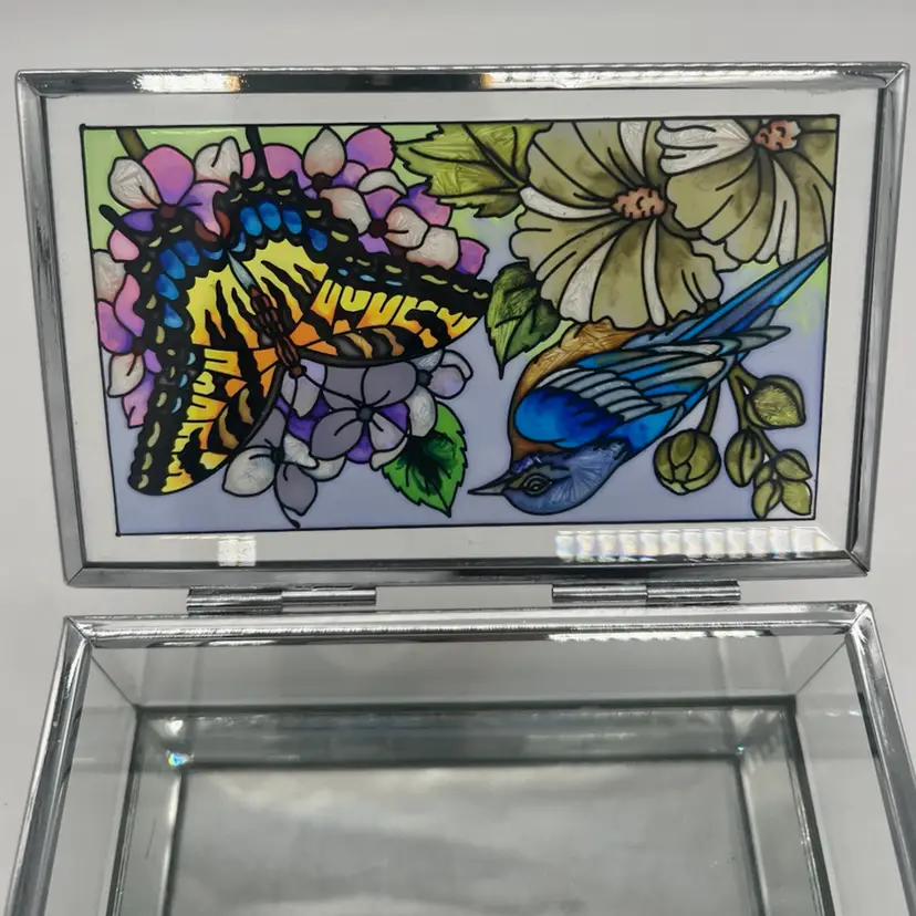 Amia Hand Painted Bluebird Butterfly Florals Beveled Glass Footed Mirrored Bottom Jewelry Trinket Box