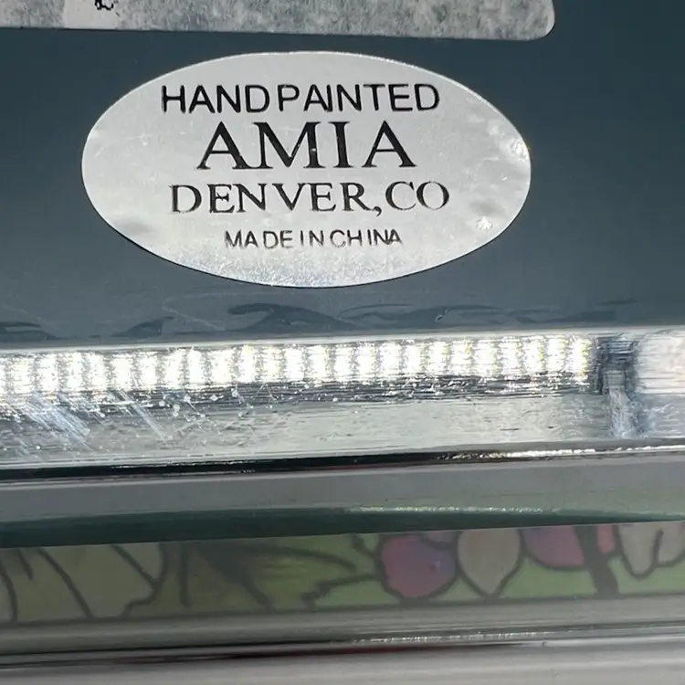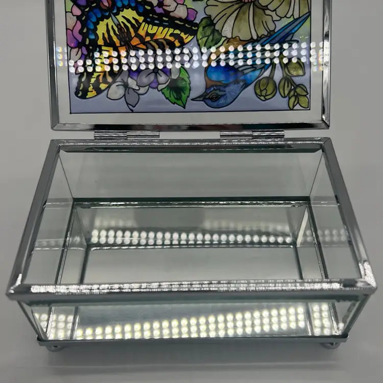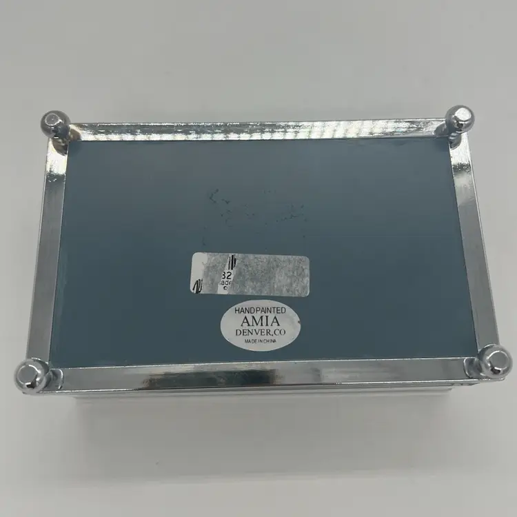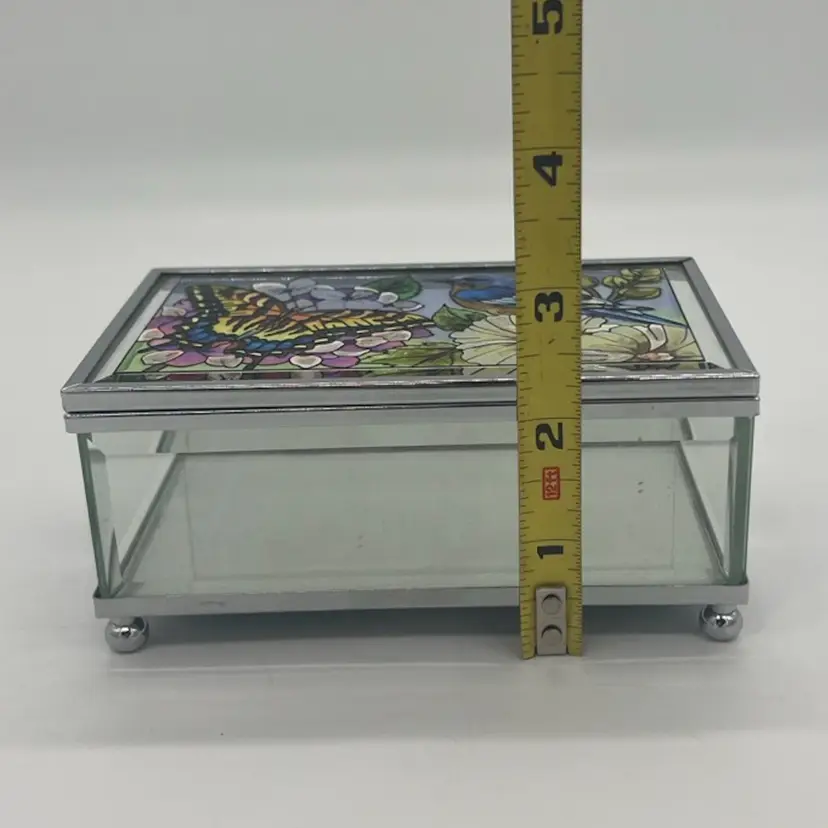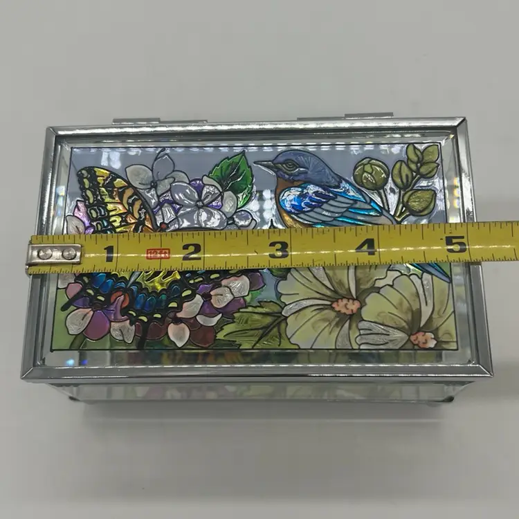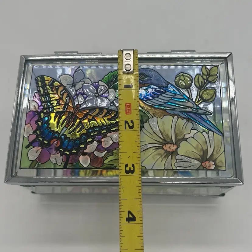 Amia Hand Painted Bluebird Butterfly Florals Beveled Glass Footed Mirrored Bottom Jewelry Trinket Box