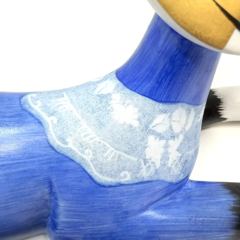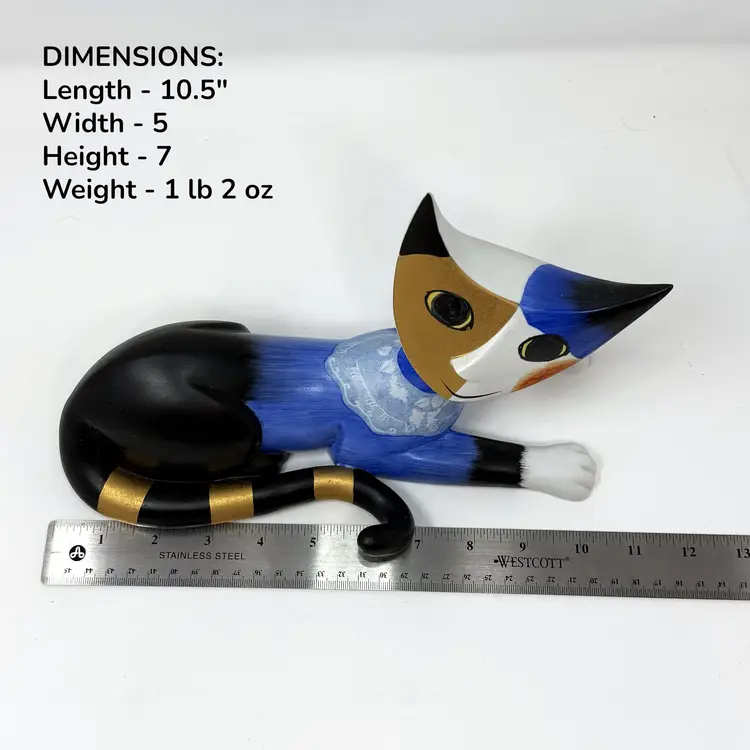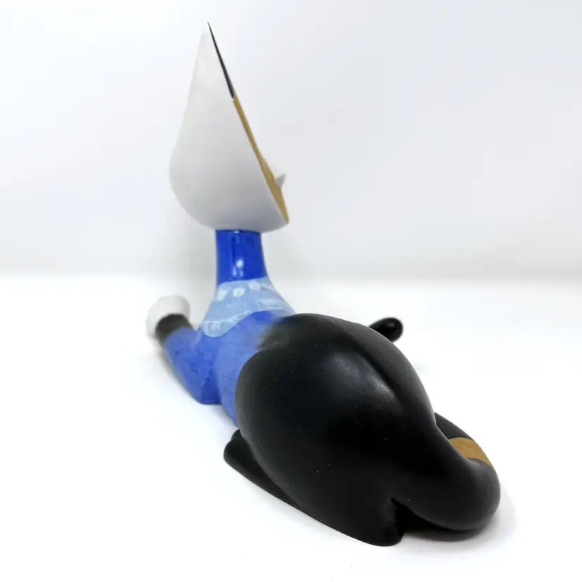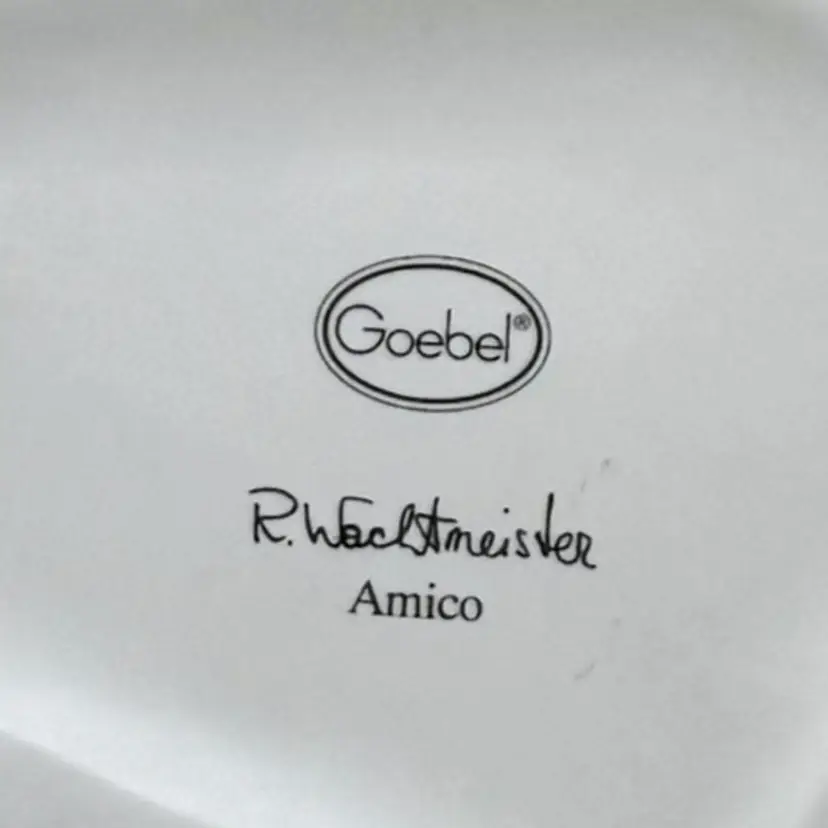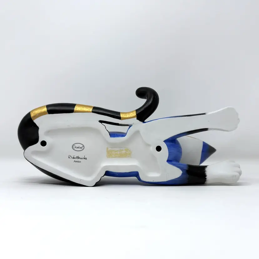 DETAILS • Measurements: approx. 10.5" L × 5" W × 7" H, Weight: 1 lb 2 oz • Material: Ceramic • Colors / finish: Blue, black, white, gold, multicolor painted finish • Maker / markings: Goebel oval mark; signed “R. Wachtmeister / Amico” • Origin: Germany • Probable era: Circa 1998–2004 • Condition: Excellent vintage condition; no chips, cracks, or repairs observed