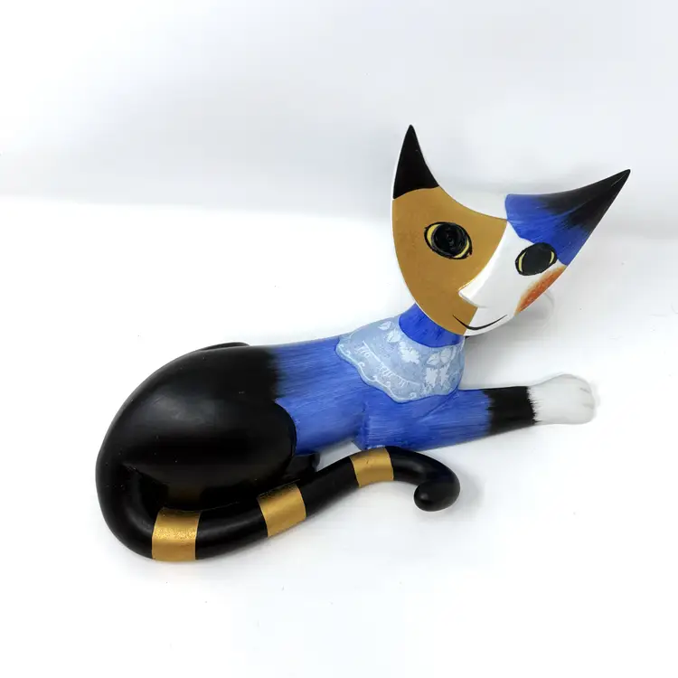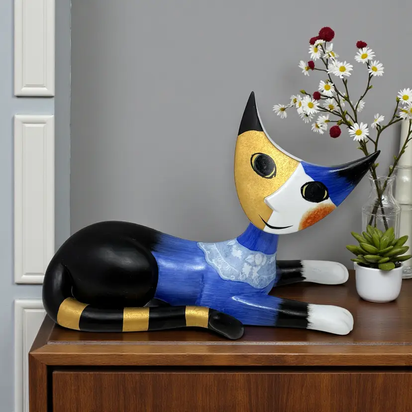 Curated Amico Wachtmeister reclining cat sculpture by Goebel, crafted in Germany with bold blue, black, and gold modernist detailing.