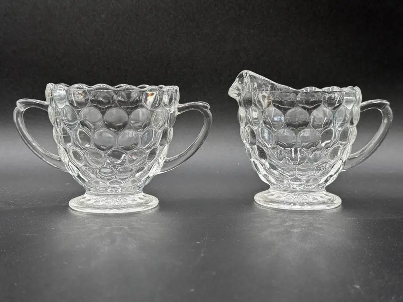 Open sugar measures 5” handle to handle and 3” tall. Creamer measures 4.5” handle to spout and 3 1/2 inches tall.