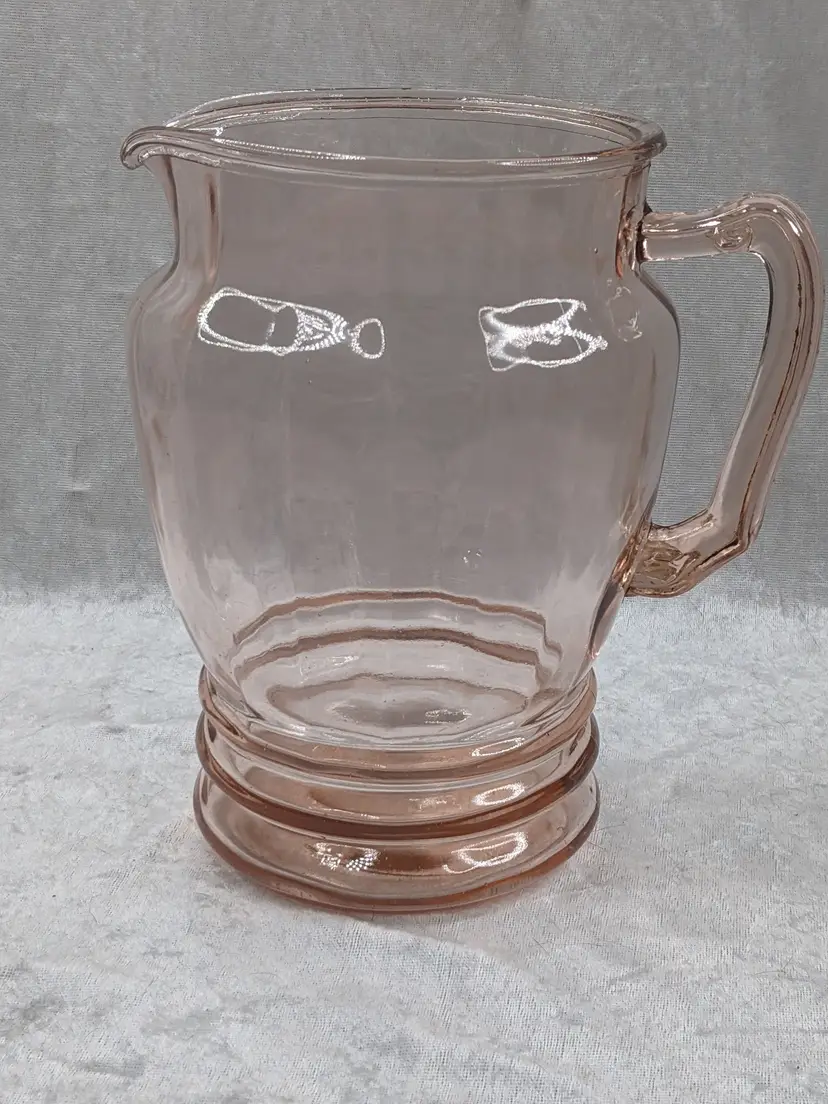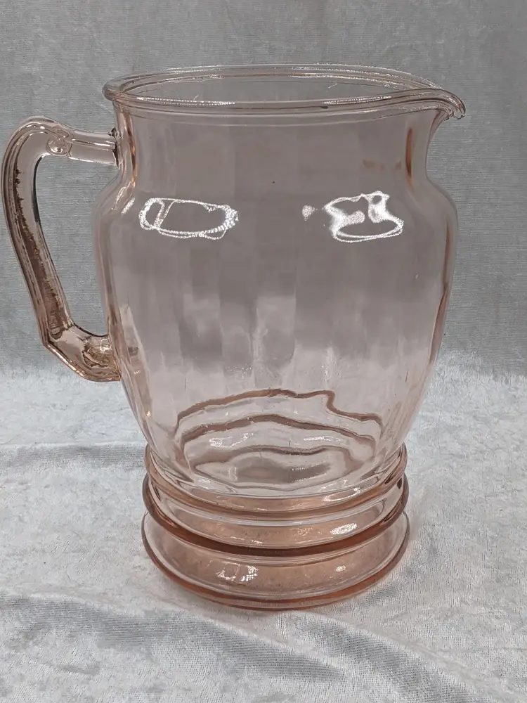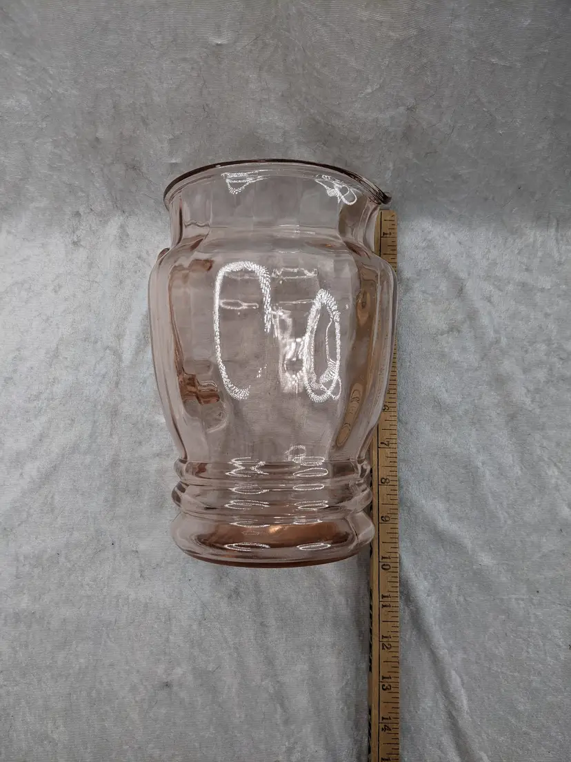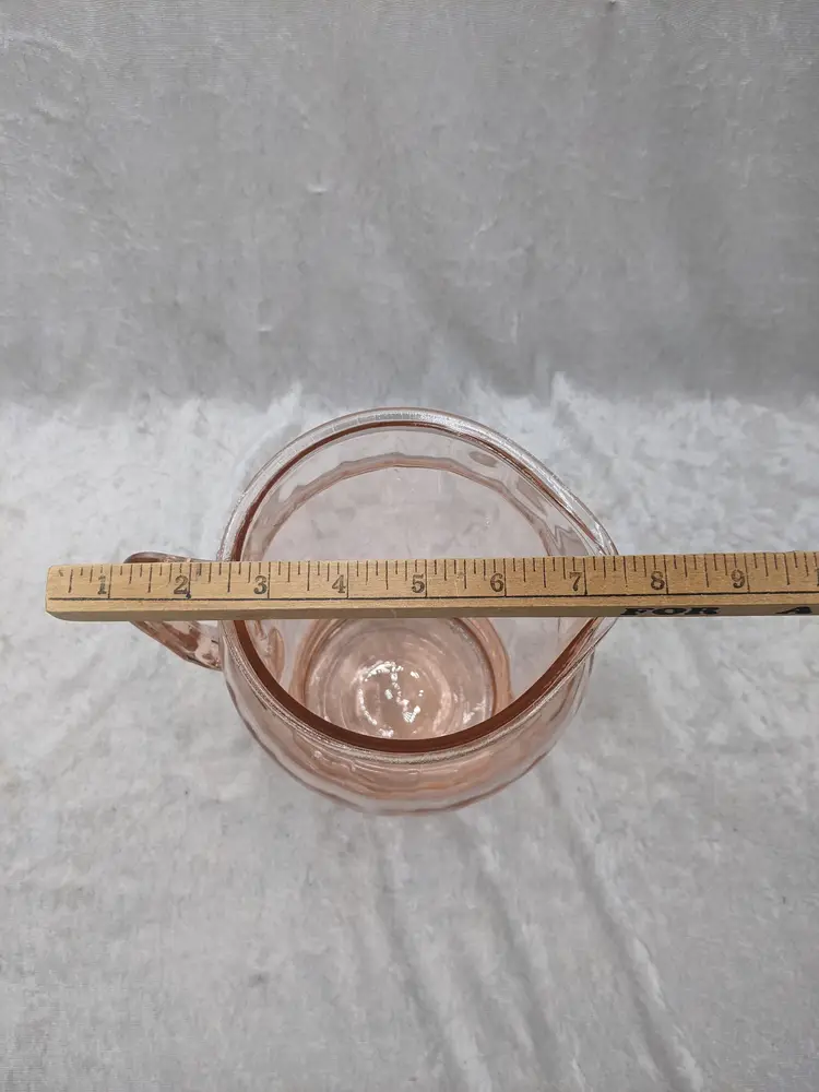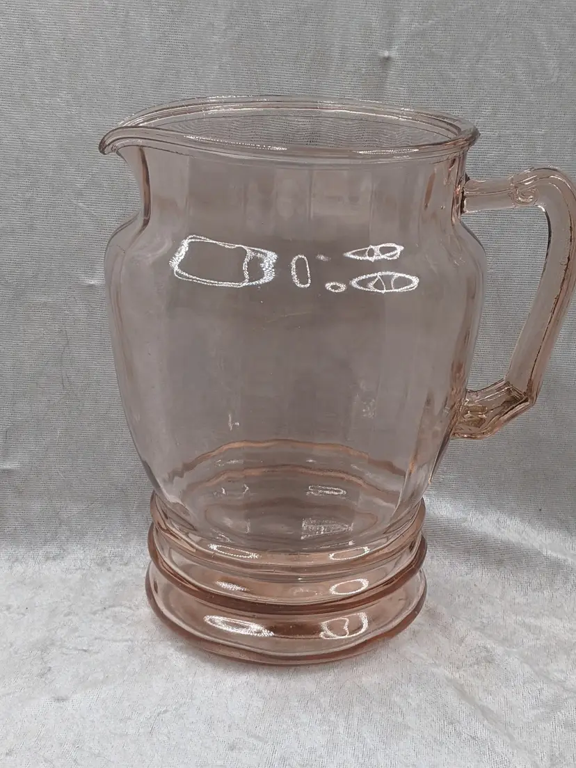 Anchor Hocking Pink Depression Glass Pitcher Pillar Optic with bottom rings Pattern. It is 8.5" tall holds 72oz. Would make a nice gift.Made in the 1930s big enough to hold lots of lemonade , cider Christmas punch. Great condition Clean with no damage.no chips or cracks no weird smells. Please check the photos for details. Comes from a smoke free home. We do have pets.