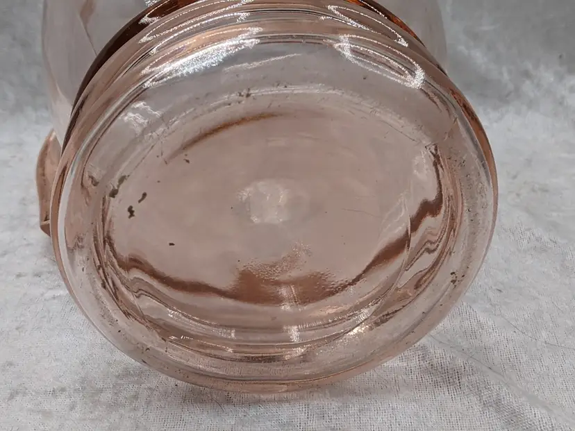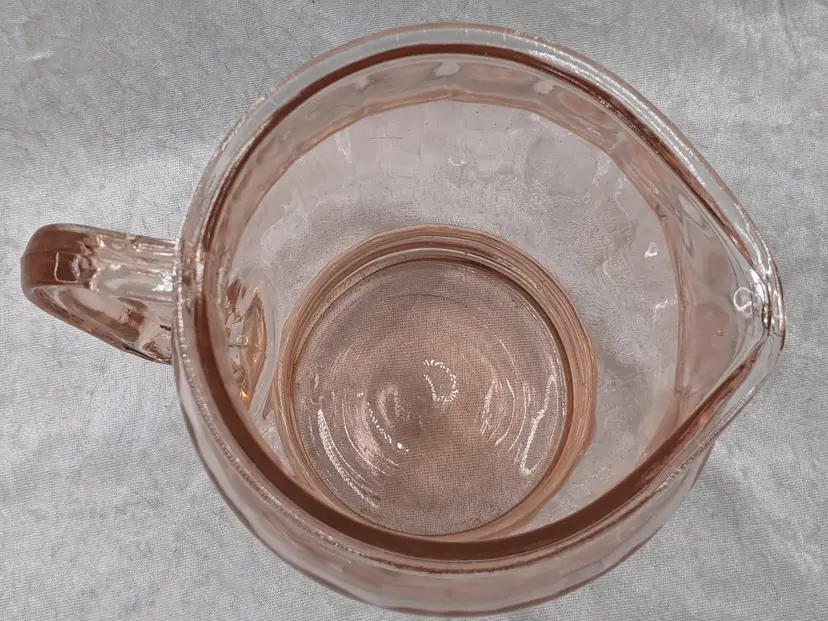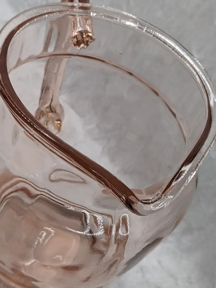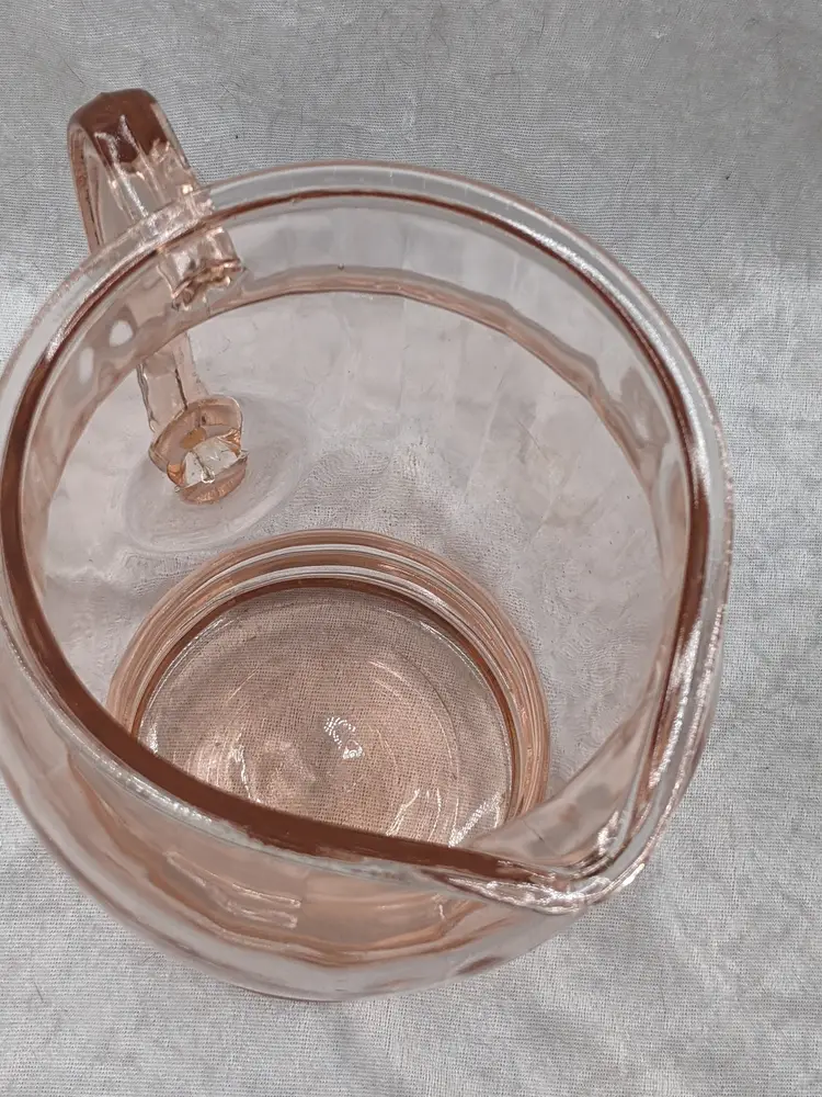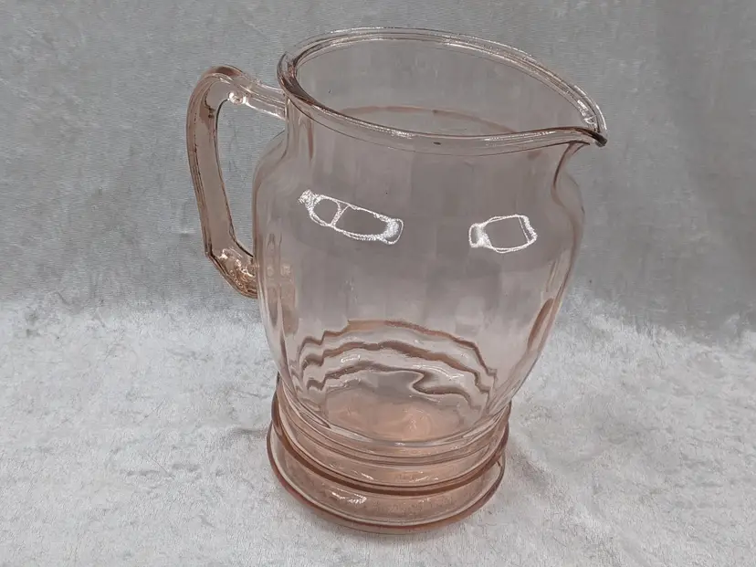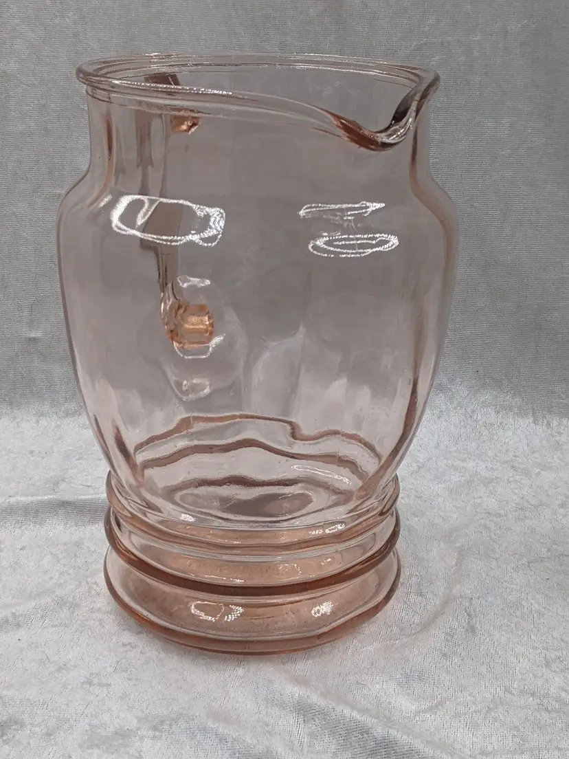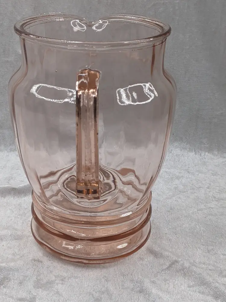 Anchor Hocking Pink Depression Glass Pitcher Pillar Optic with bottom rings Pattern. It is 8.5" tall holds 72oz. Would make a nice gift.Made in the 1930s big enough to hold lots of lemonade , cider Christmas punch. Great condition Clean with no damage.no chips or cracks no weird smells. Please check the photos for details. Comes from a smoke free home. We do have pets.