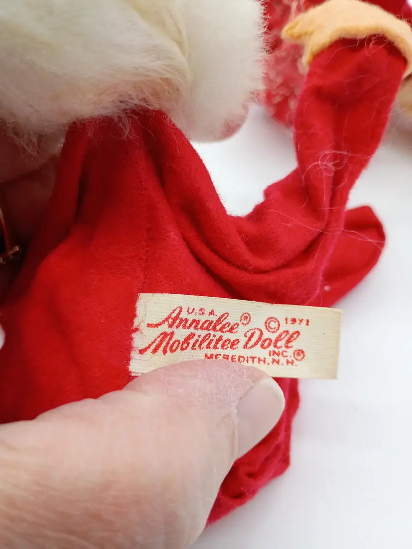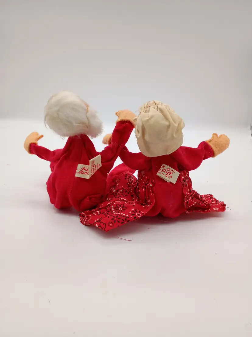 Annalee Christmas 1971 Mr. and Mrs. Santa. These are designed to hug a small basket or each other or a candle stick. These are about 6 inches tall when standing. They need support to free stand but do well sitting. This is preowned without original hang tags. No rips tears odors holes stains or fraying Excellent condition for it's age. Ships USPS domestically and eBay International Shipping globally