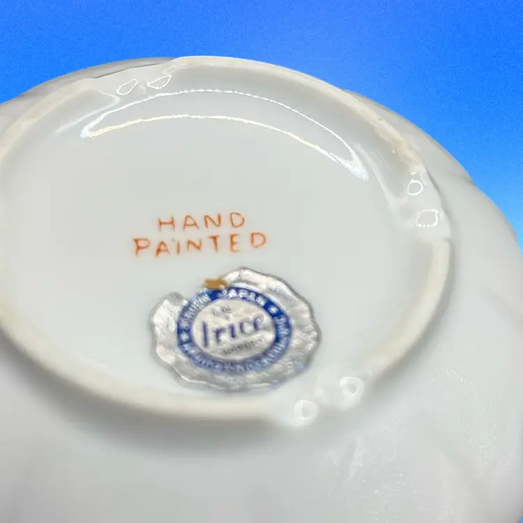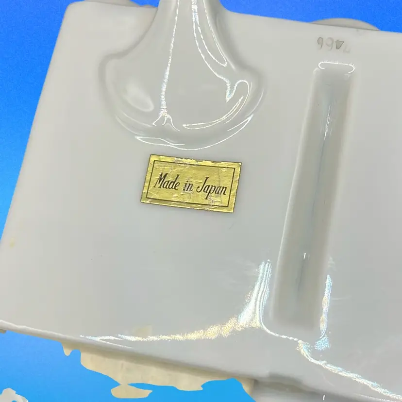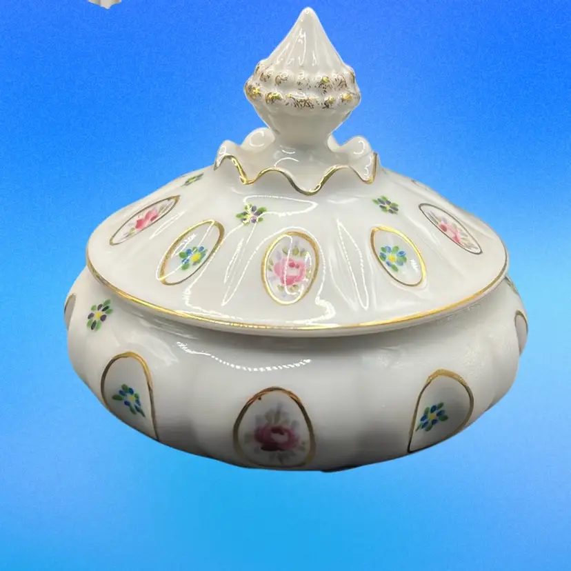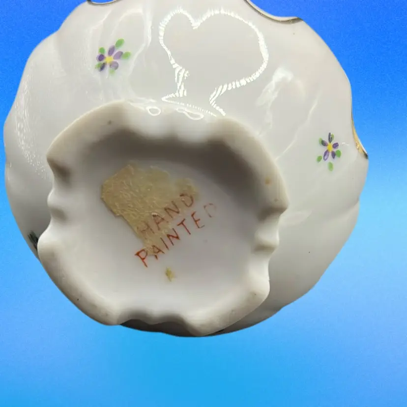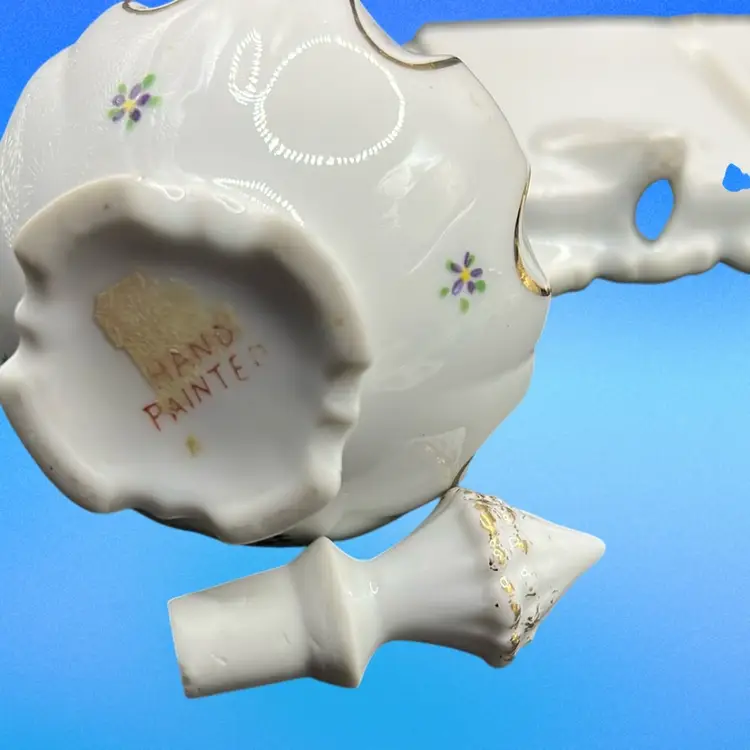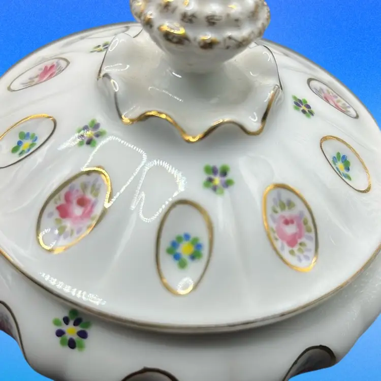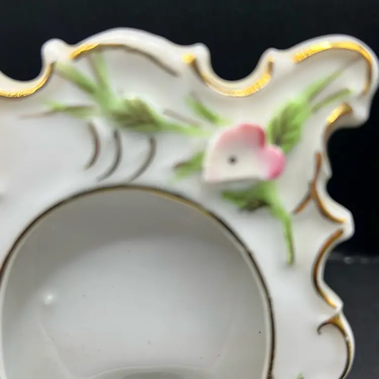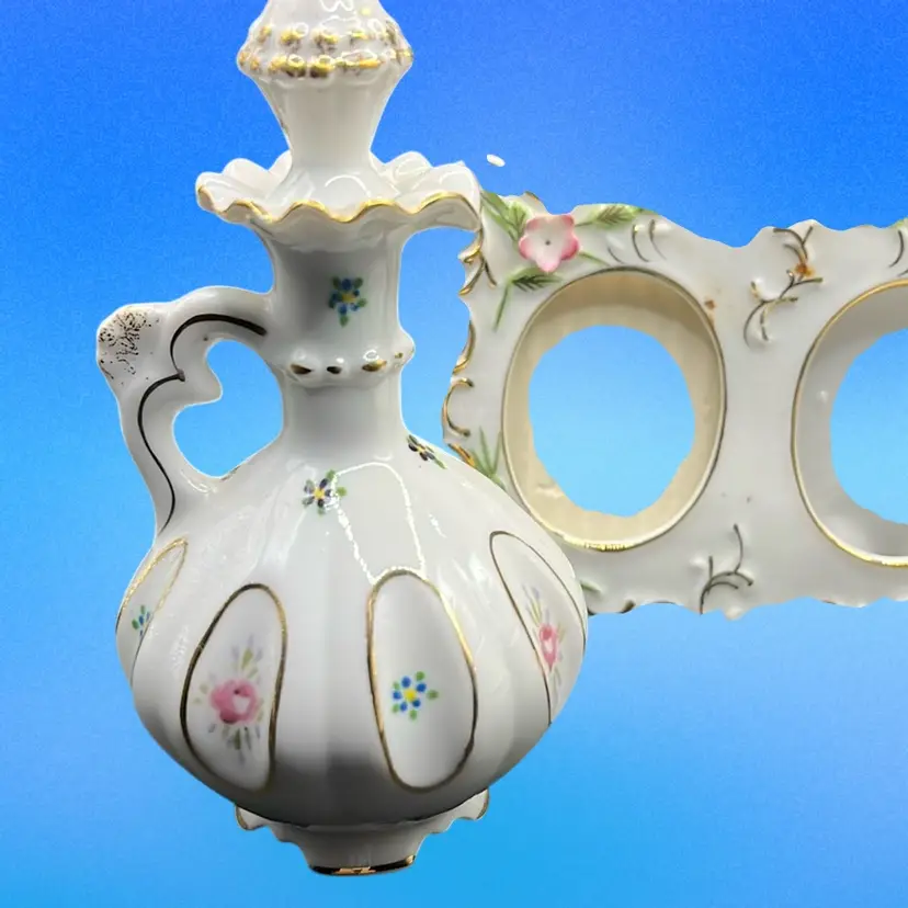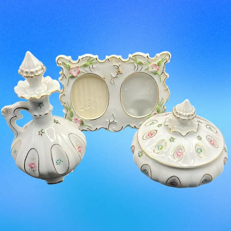 Picture frame has a chip on the little pink flower powder jar has a tiny chip under rim of base.