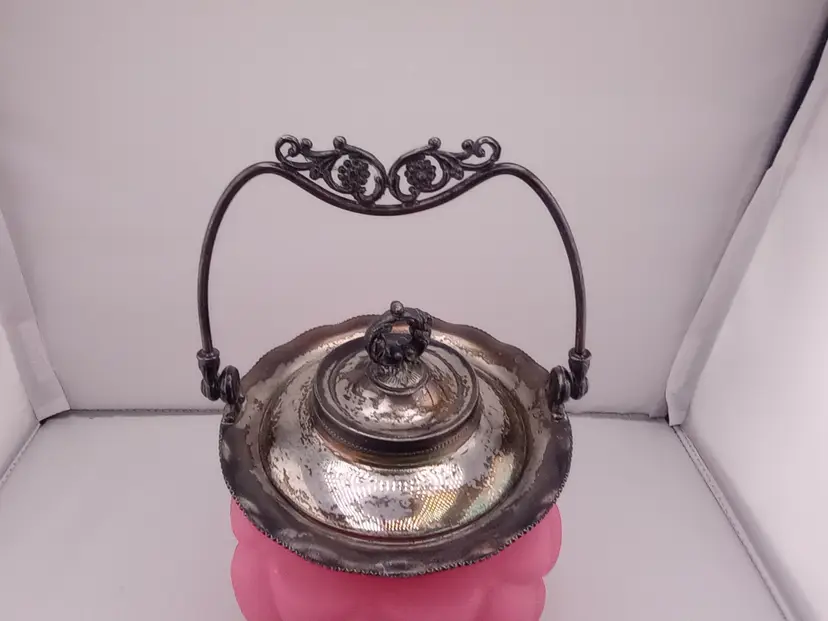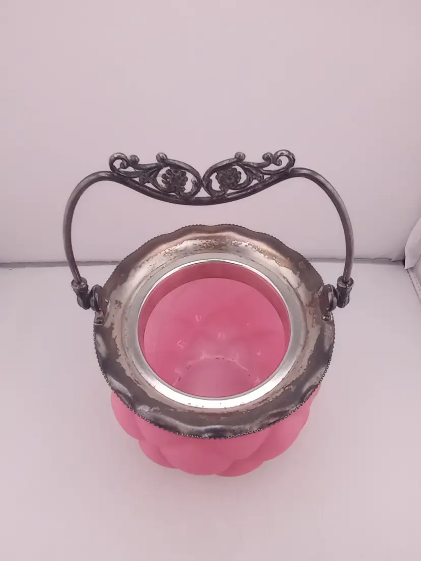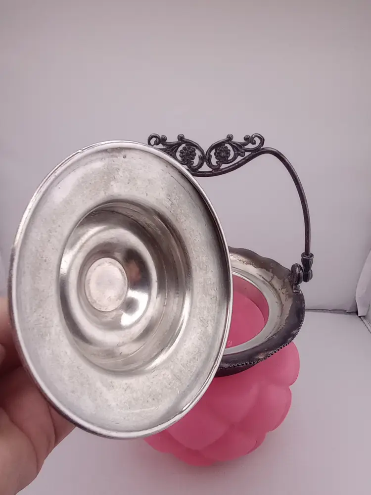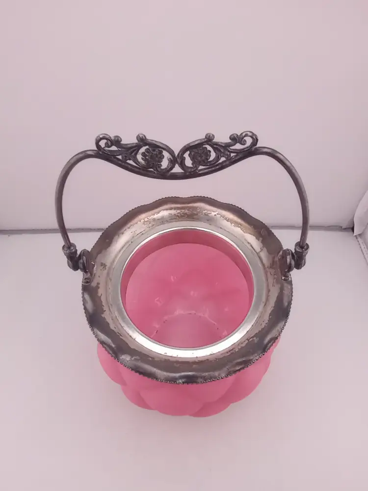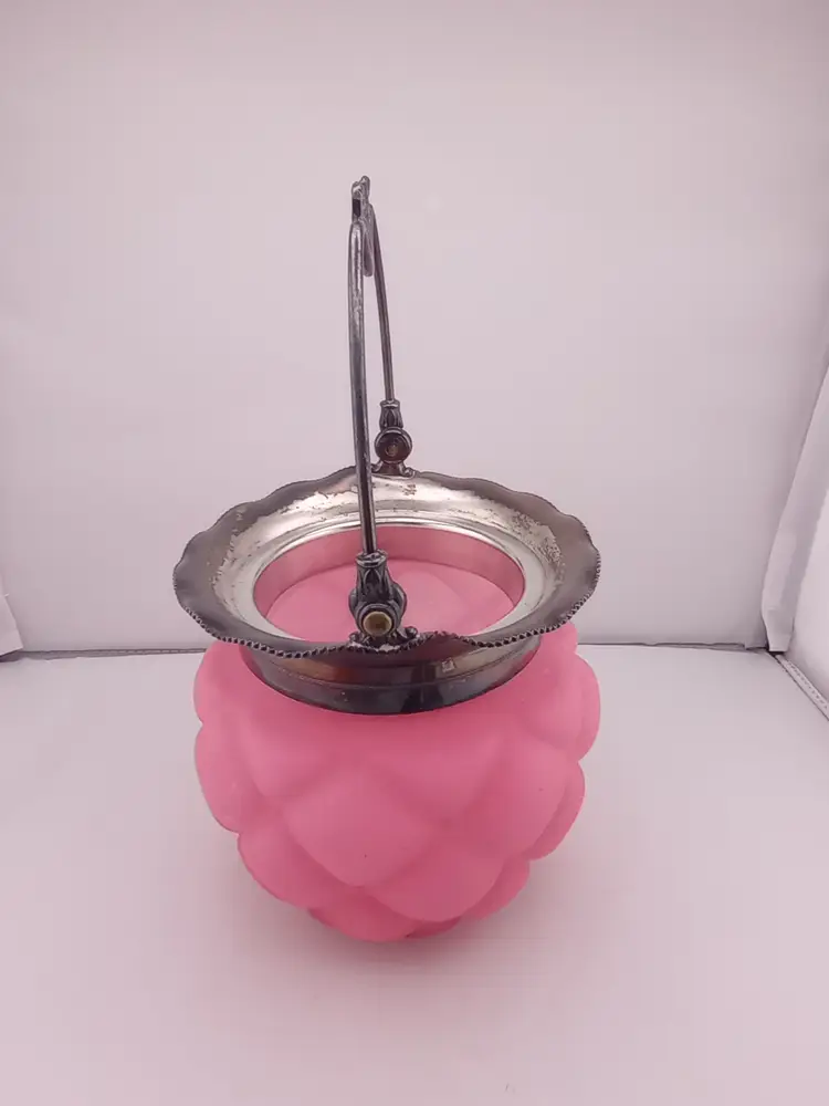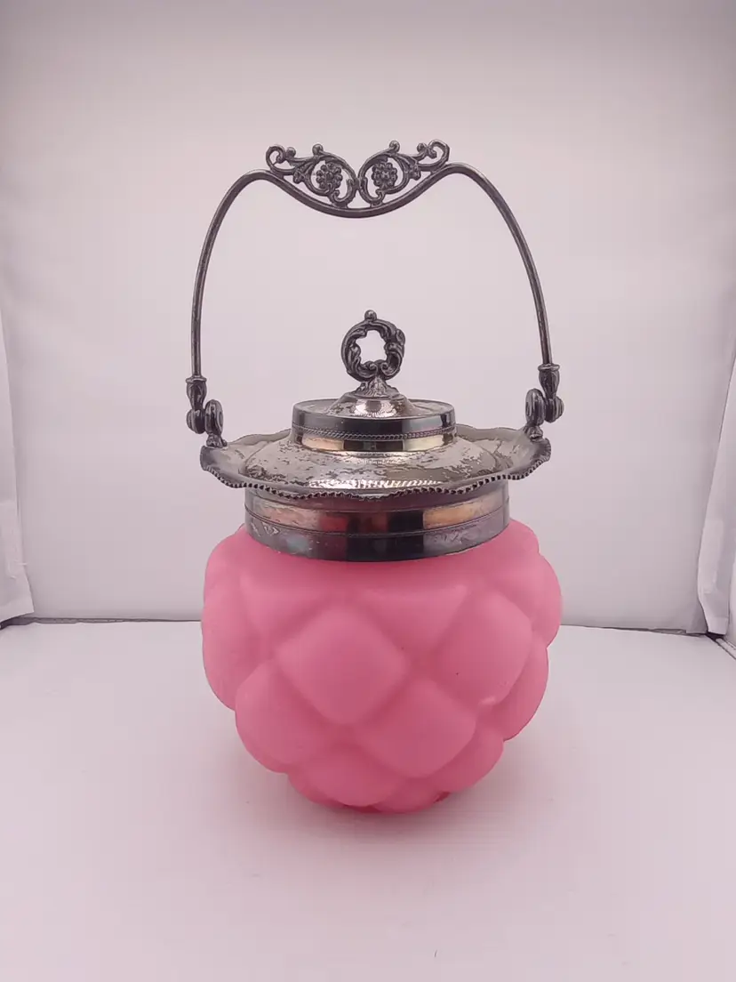 This is a stunning antique biscuit jar from Consolidated Glass in pink satin quilted glass. It has it's lid and handle and is in excellent condtion with no noted damage. It's approximately 11" tall and 6" across.