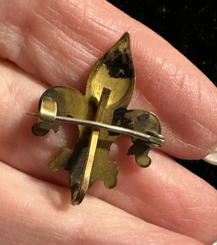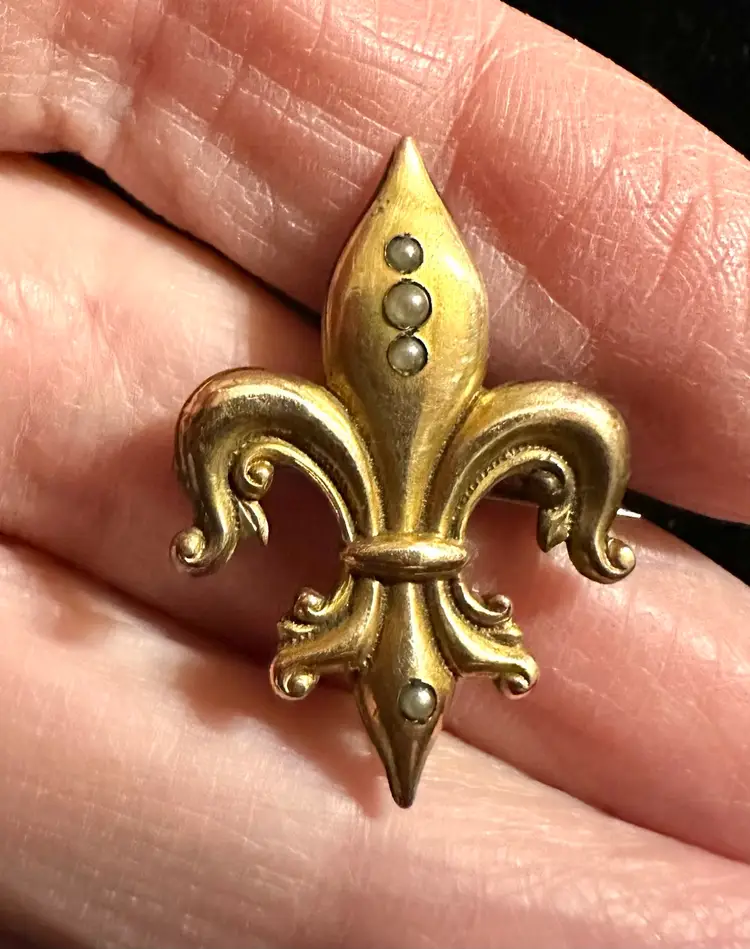 Lovely antique Victorian Fleur de lis watch pin / chatelaine. It is gold filled set with seed pearl. It measures 1 1/8” x 7/8”. Condition is very good.