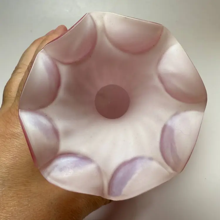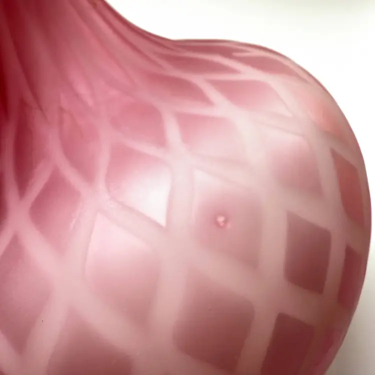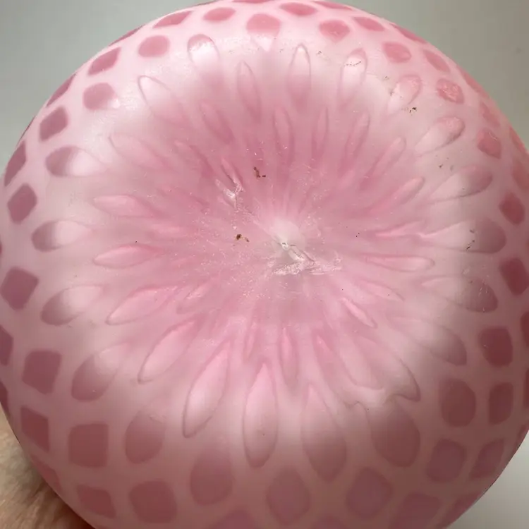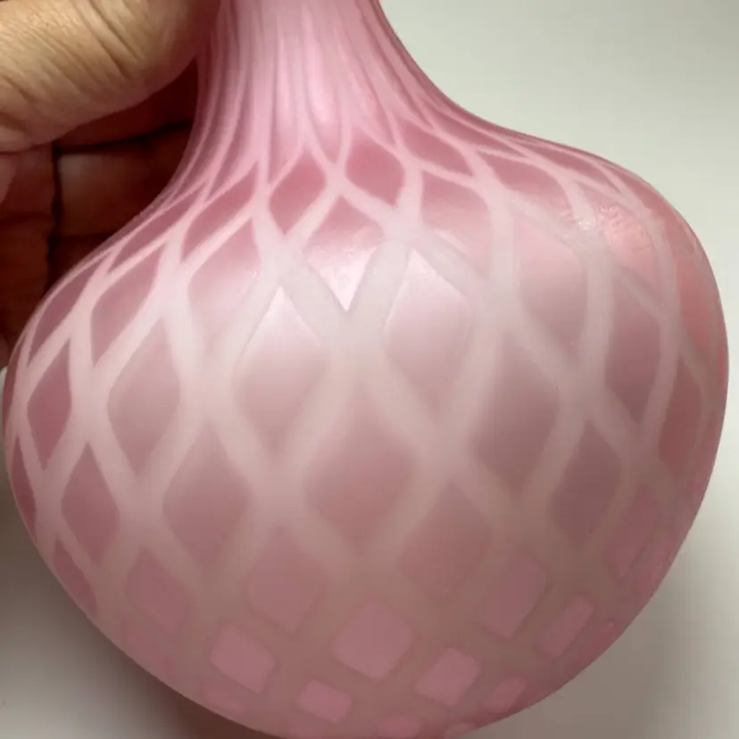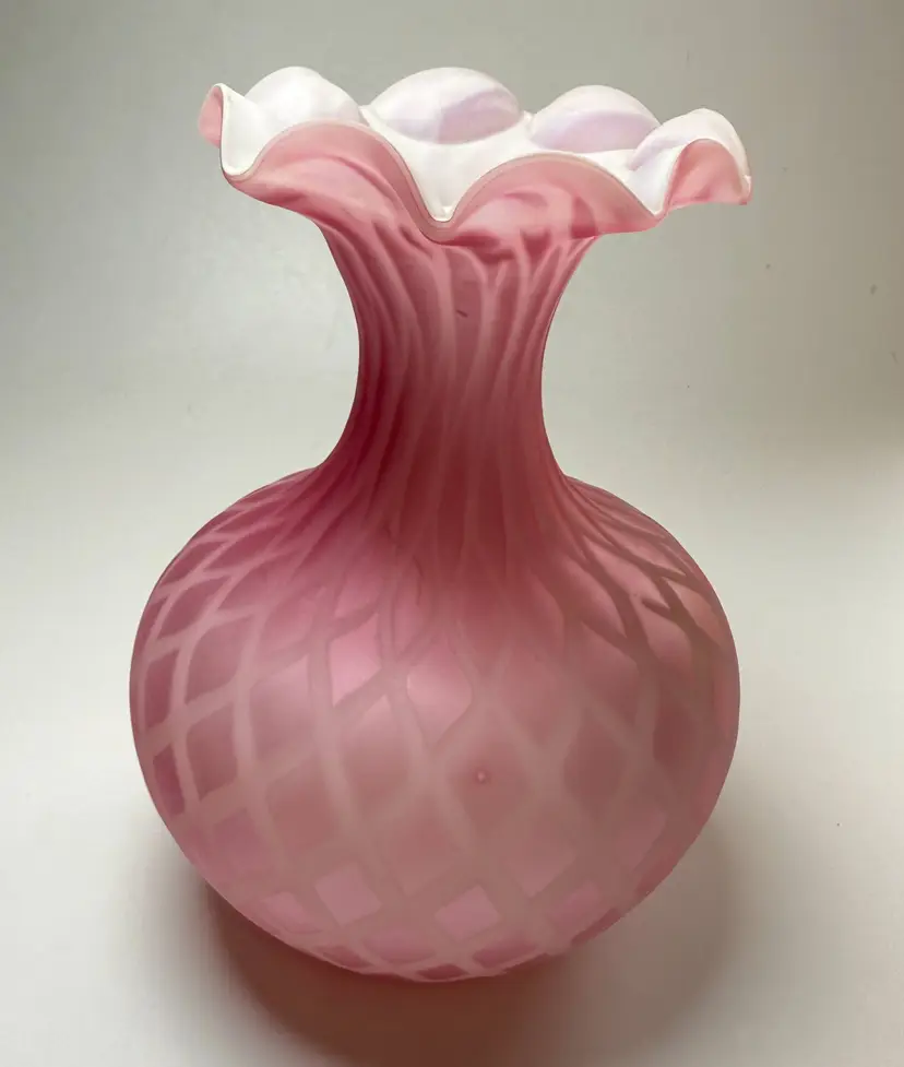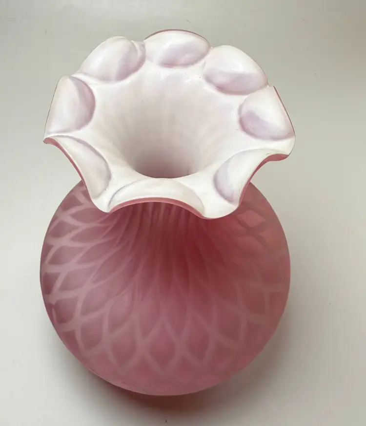 Antique Victorian Mother-of-Pearl Satin Glass Bulbous Vase Quilted Diamond Pattern Cased. Late 19th century around 1880-1910. Exterior has a frosted soft satin finish. Raised optic diamond quilted pattern. Top edge ruffled or crimped. Most likely made by Mt Washington glass. About 7" tall x 5" diameter x 4" diameter mouth. Excellent condition. No chips, no cracks. Small bubble on side in glass as shown.