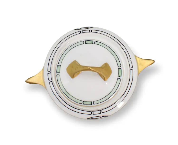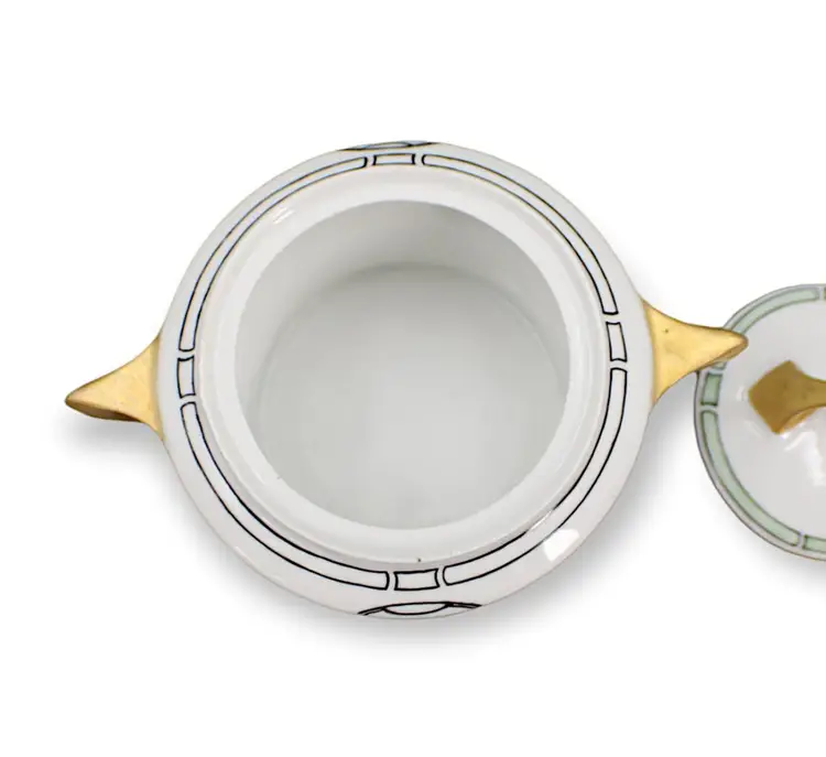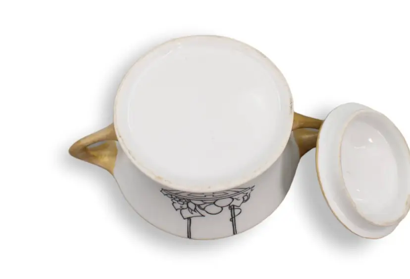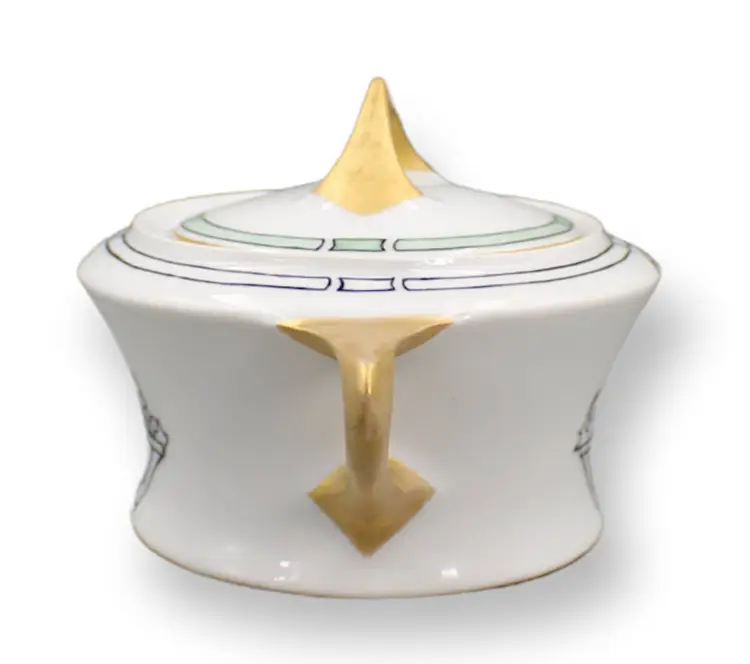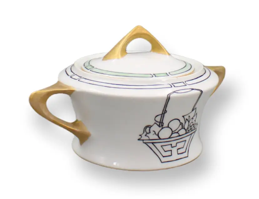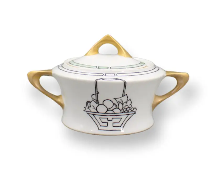 Beautiful Vintage Art Deco Bavaria Sugar Bowl With Hand Painted Fruit Basket Design Green And Gold Trim. Sugar Bowl Measures 6 1/4" Long (from handle to handle) x 4 1/4 diameter (at rim).