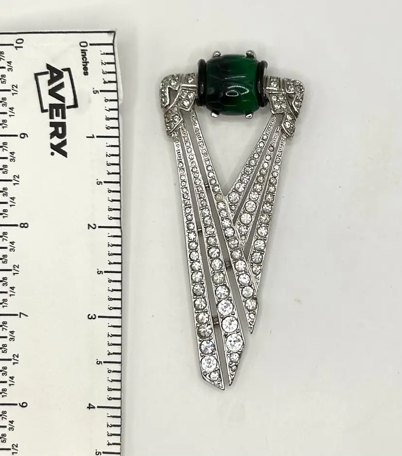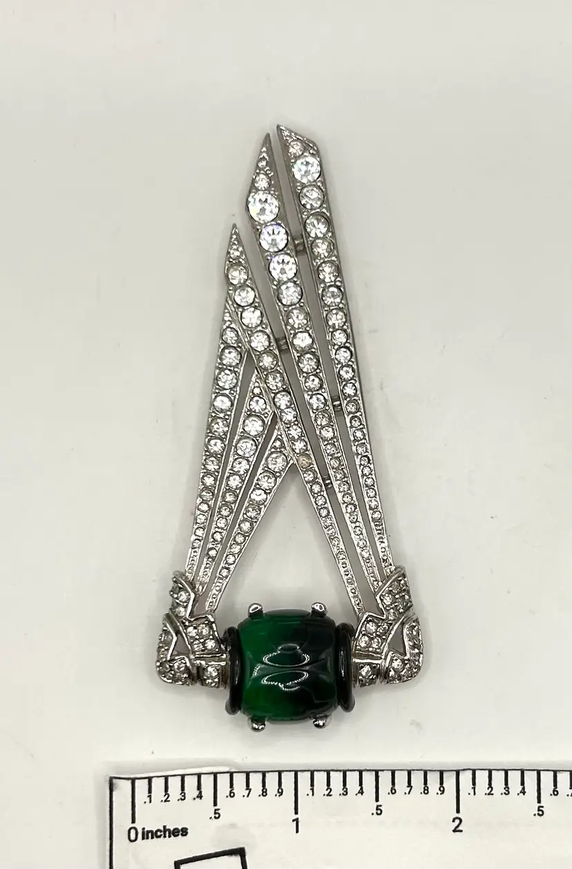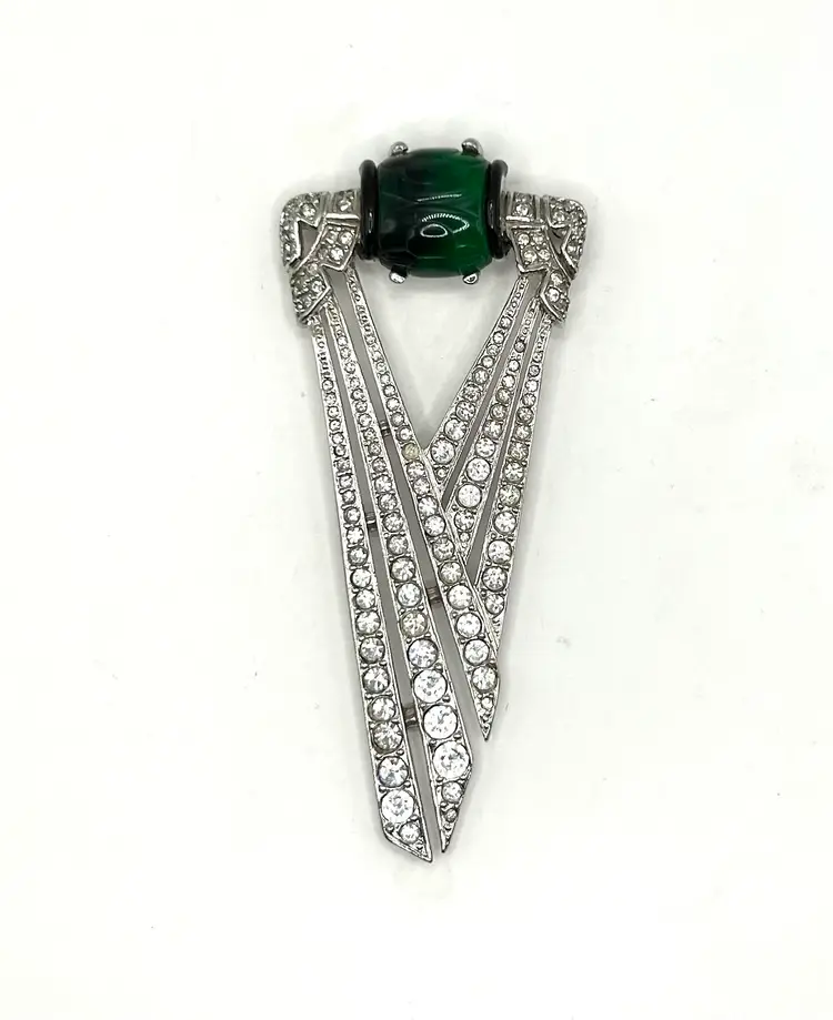 Gorgeous! Art Deco Heirloom of Tomorrow was a high end costume jewelry maker from the late 80’s through early 90’s. The pieces are rare and collectible. Gorgeous emerald green glass, no missing rhinestones.