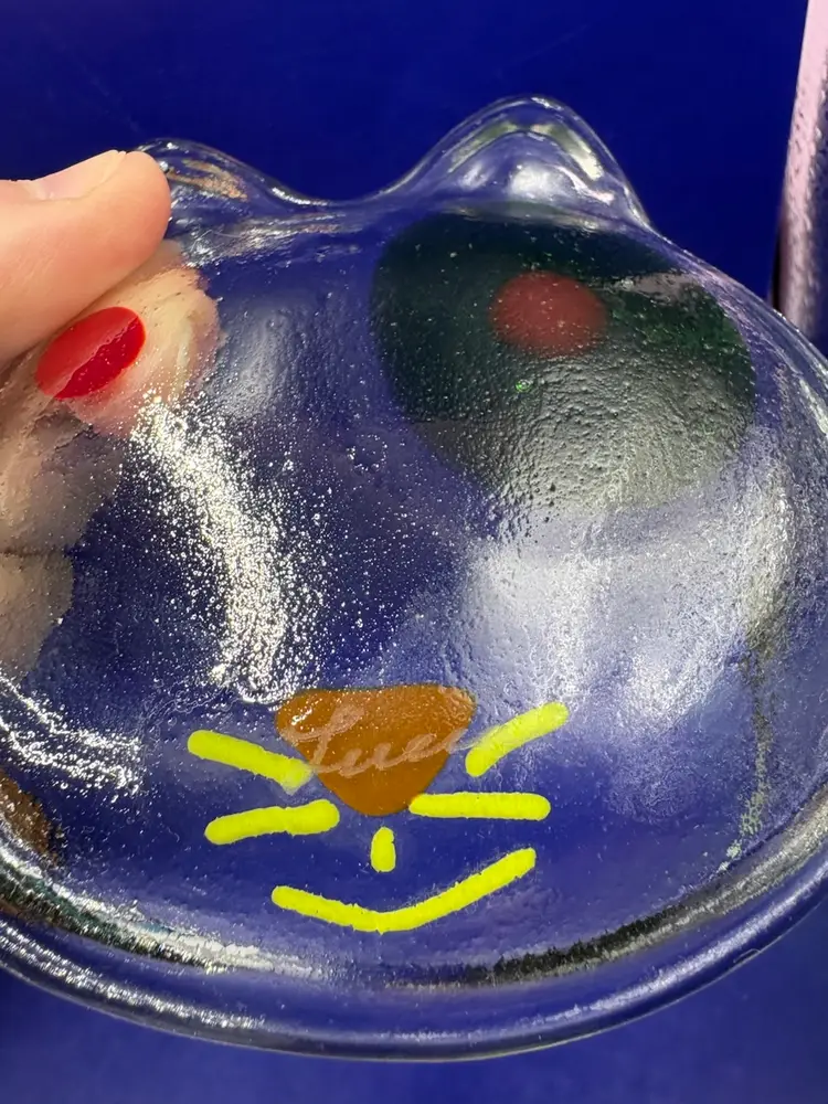 Art Glass Cat Trinket Tray Signed(cannot make out signature) “Lucca” “ Lucia” ??? Measures at tallest and widest at 4 inches Fun design of cat with red eyes, green eye patc, brown nose and whiskers No chips or cracks