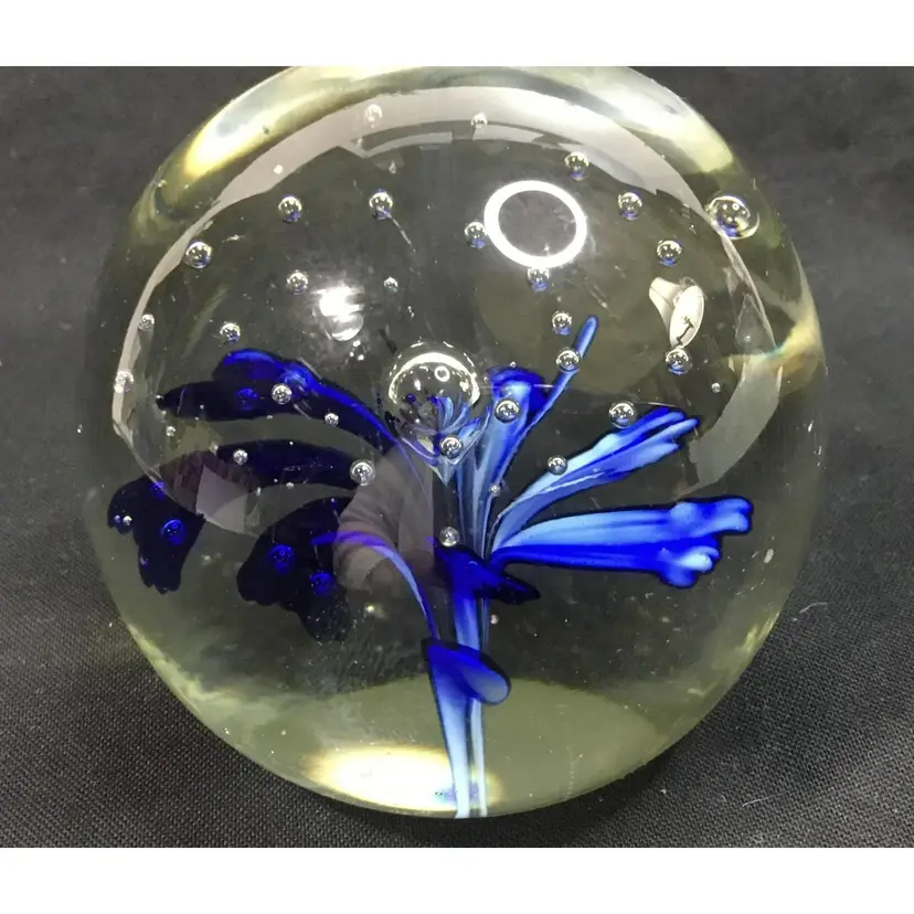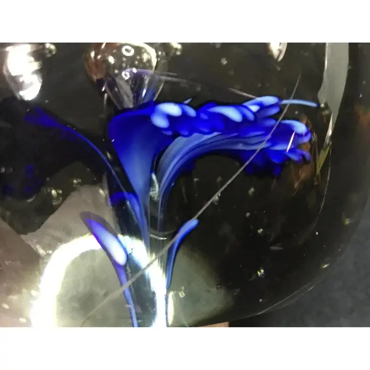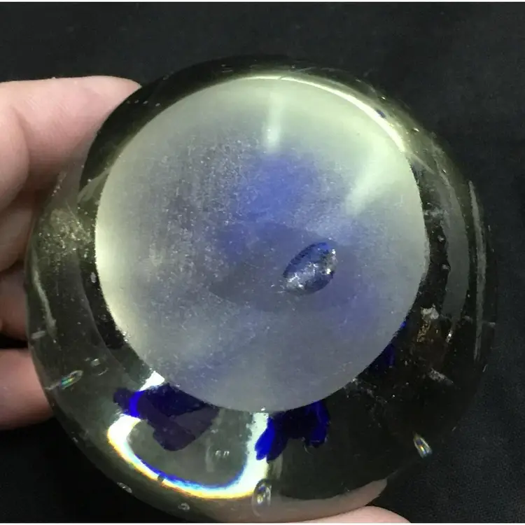 2.5 inches x 2.5 inches, weighs 13 ounces, art glass with intensely blue flower inside. Decorated with a layer of bubbles, larger bubble is the center of the flower. Pontil mark on bottom indicates hand blown glass item. Manufacturer's flaw, a crease inside the glass, also minor tiny scratches (see photos)