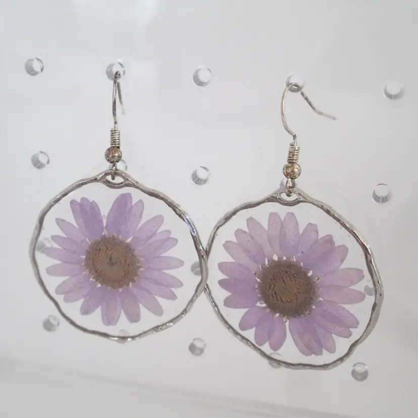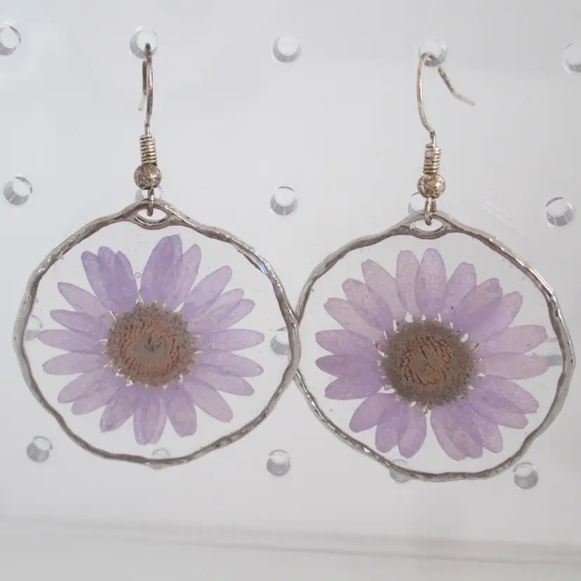 Artisan silver wrapped pink mini daisy flowers in resin earrings. They measure 1 1/3" across and drop down 2".