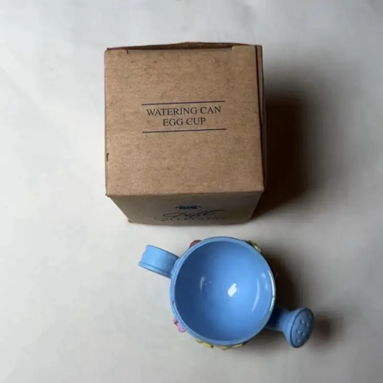 The Avon Gift Collection Watering Can Egg Cup from 1998 is a vintage collectible that adds a unique touch to your breakfast table setting. This floral-patterned egg cup features a watering can theme, making it a creative and fun addition to your kitchen decor. Crafted of ceramic with a painted finish, this multicolor egg cup is not only practical but also a charming piece that brings nostalgia to your dining experience. Perfect for collectors or those looking to add a whimsical touch to their kitchen, this original Avon egg cup is sure to be a conversation starter. 1.75” tall 3.5” wide.
