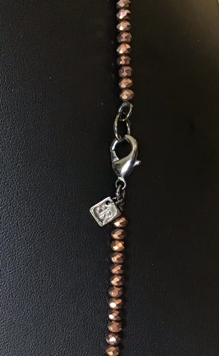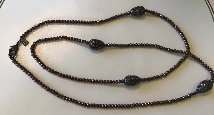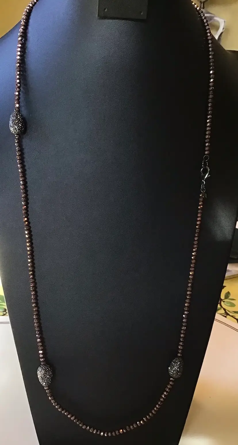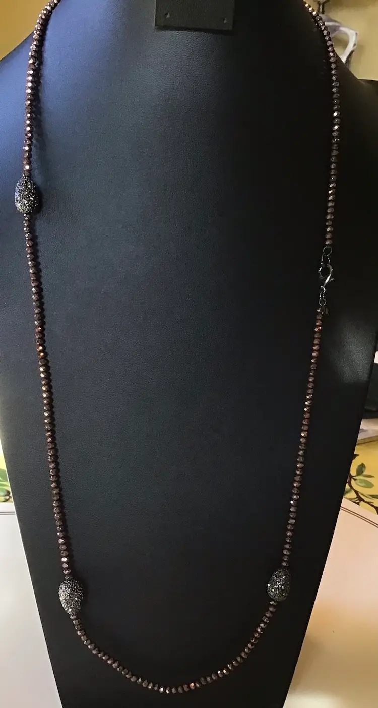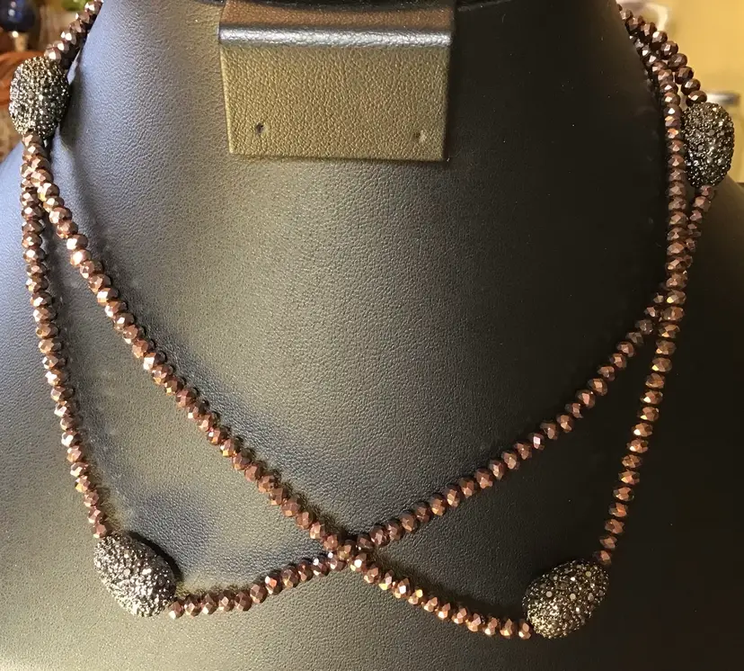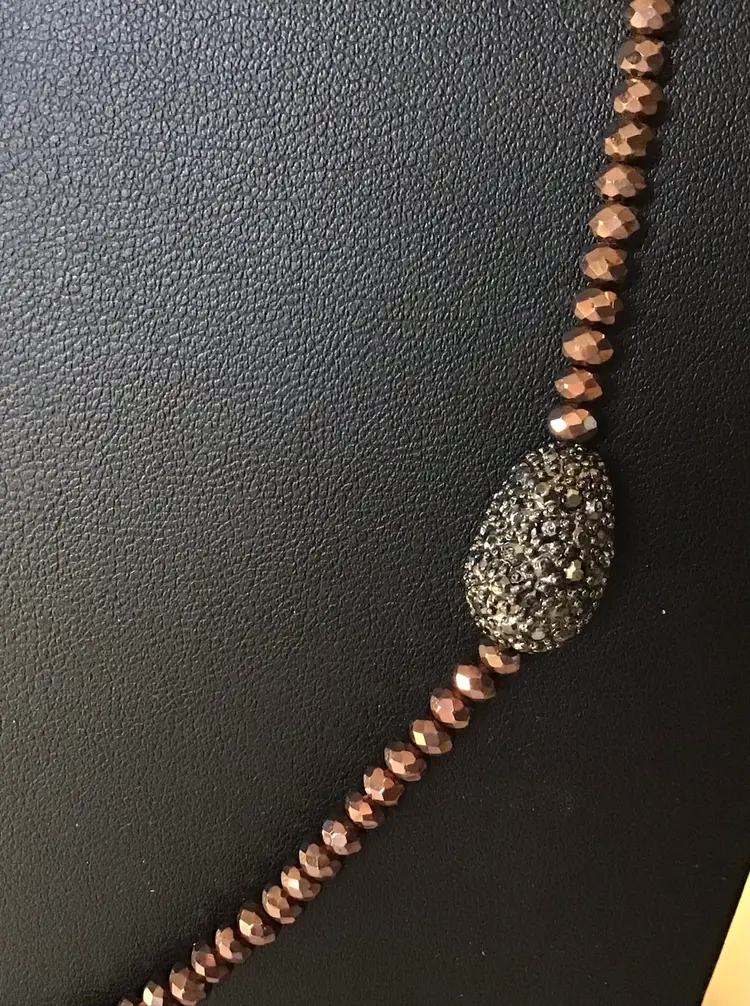 Faceted bronze beads with oval accents with black rhinestones, black metal closure 36”. #370