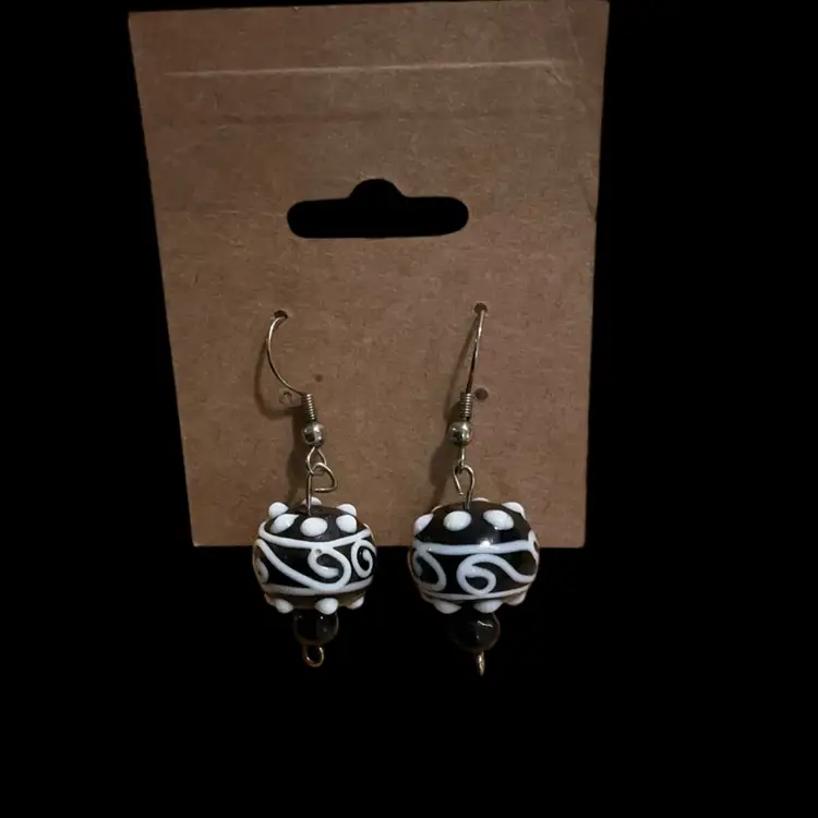 Beautiful Black & White Lampwork Glass Bead Pierced Dangle Hook Earrings. Not signed. The Artwork On These Earrings Are Beautiful!!!