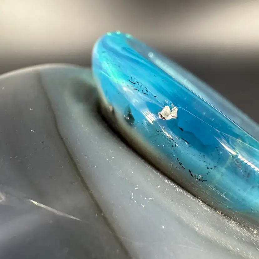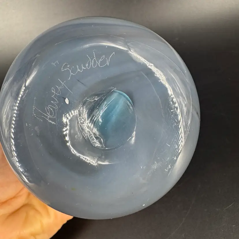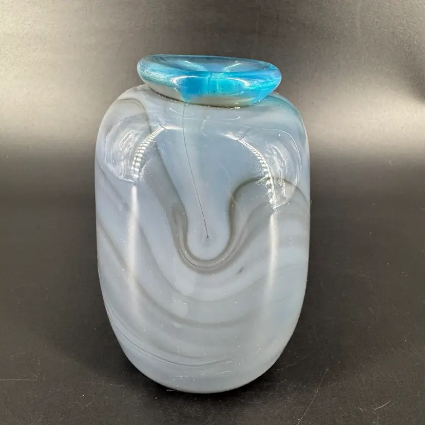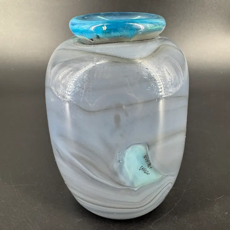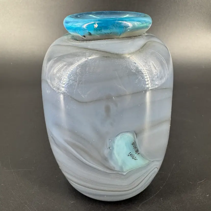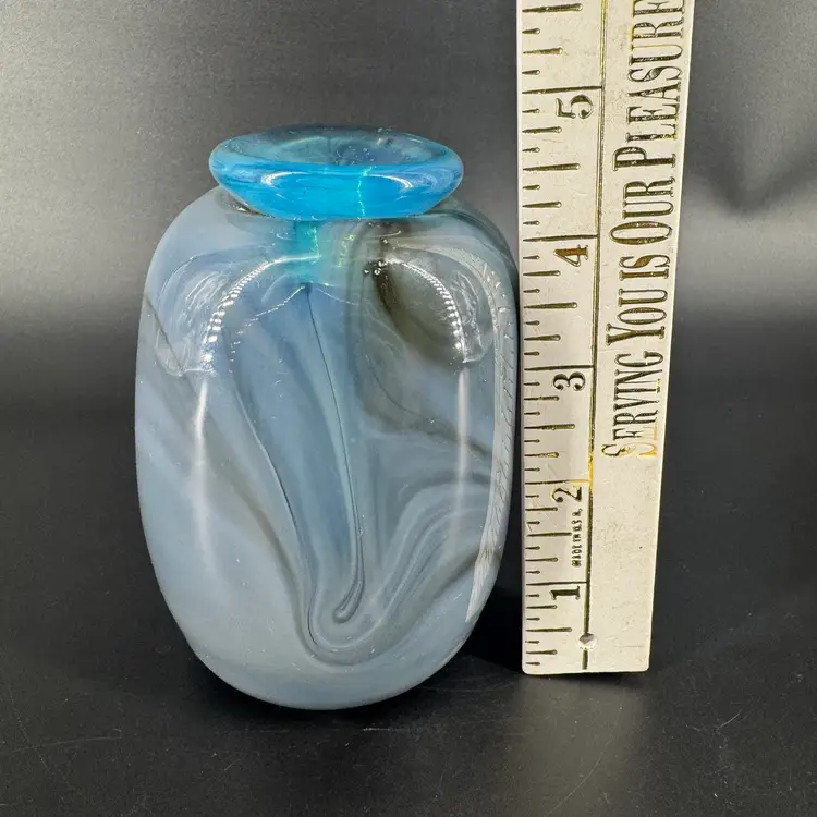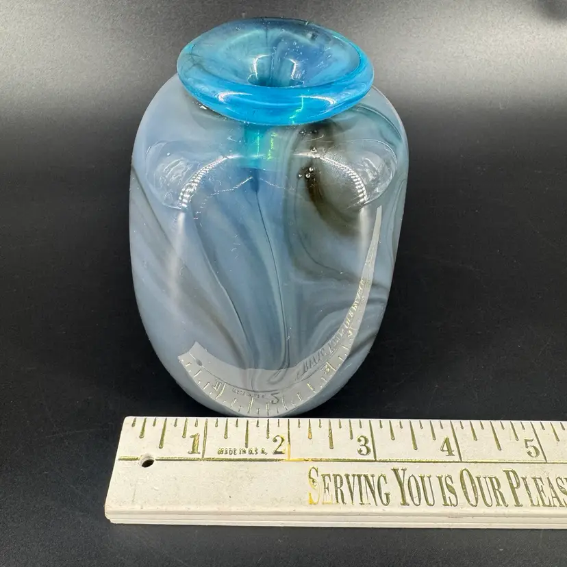 Great condition overall, there is one rough spots/possible chip on the top edge of the vase. Otherwise no other damage to note. Approx 4.5” tall x 3” wide SKU: O