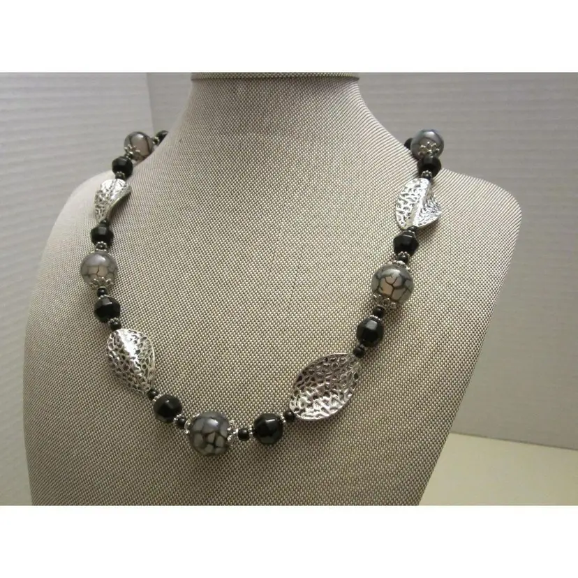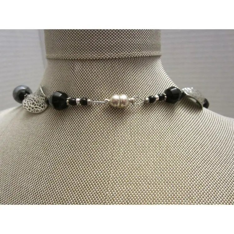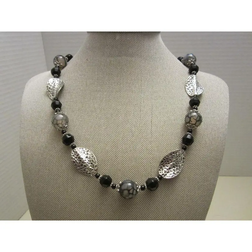 Black and marbled glass beaded necklace with silver twisted leaf necklace. The necklace measures 19". The necklace has a magnetic closure which makes it easier to put on and take off.