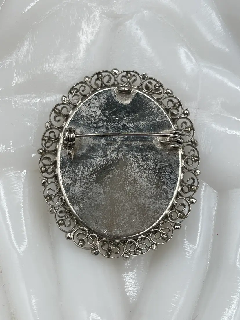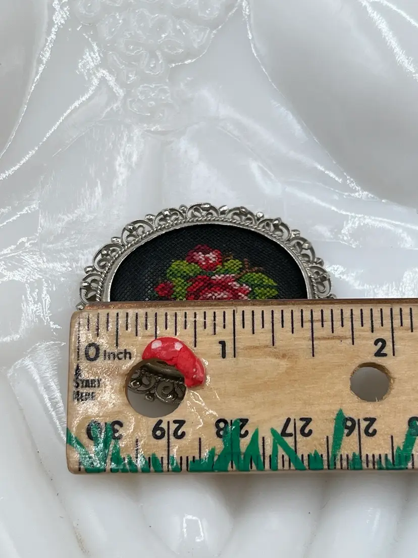 Black Floral Needlepoint Silver Tone Filigree Brooch & Pendant 1.5”