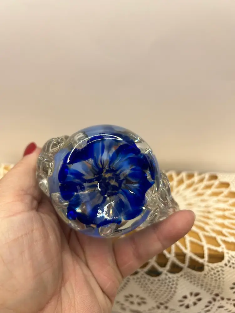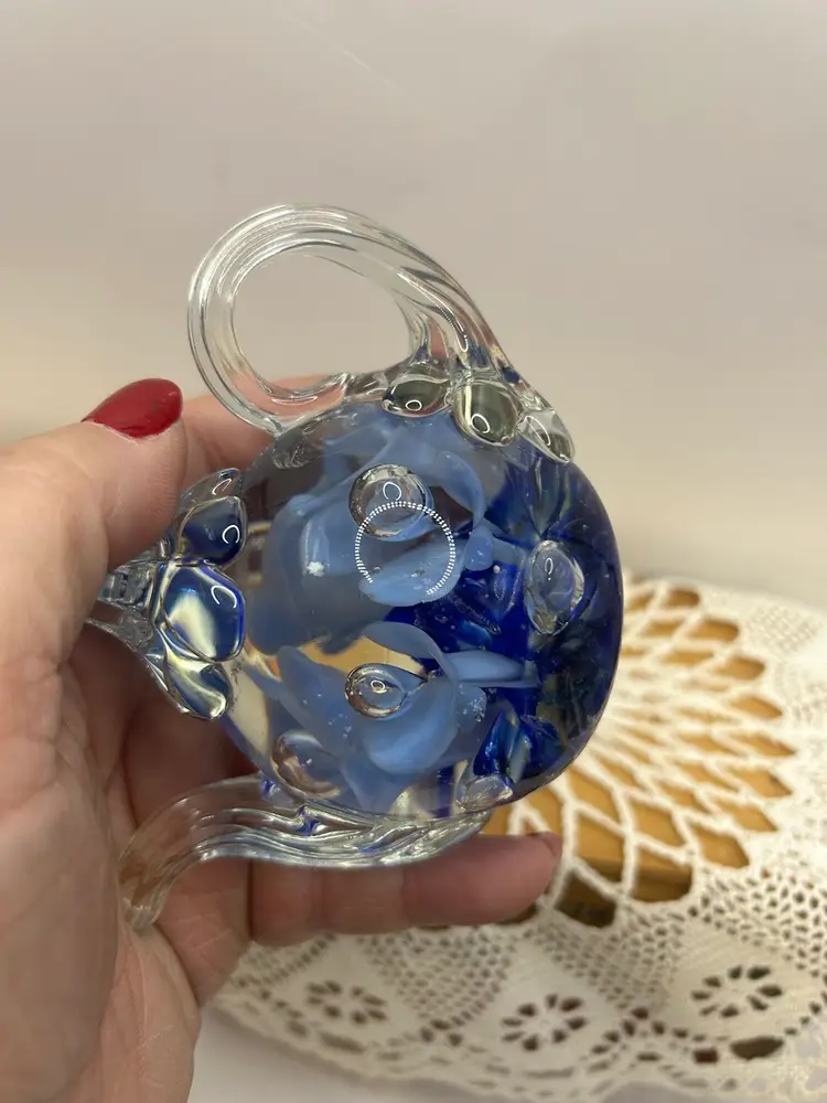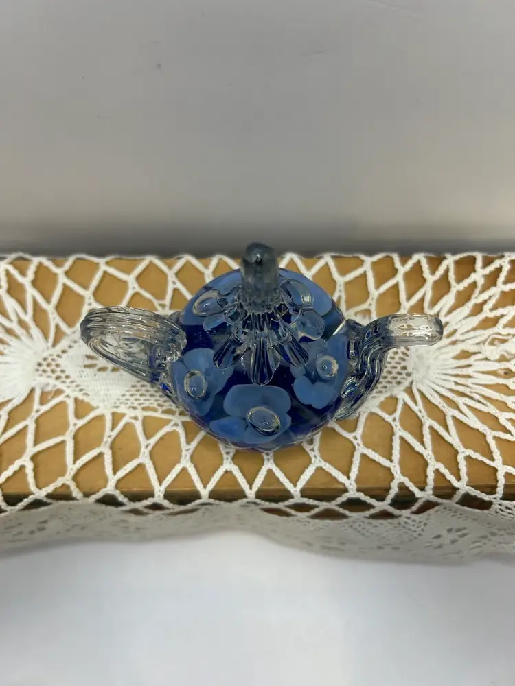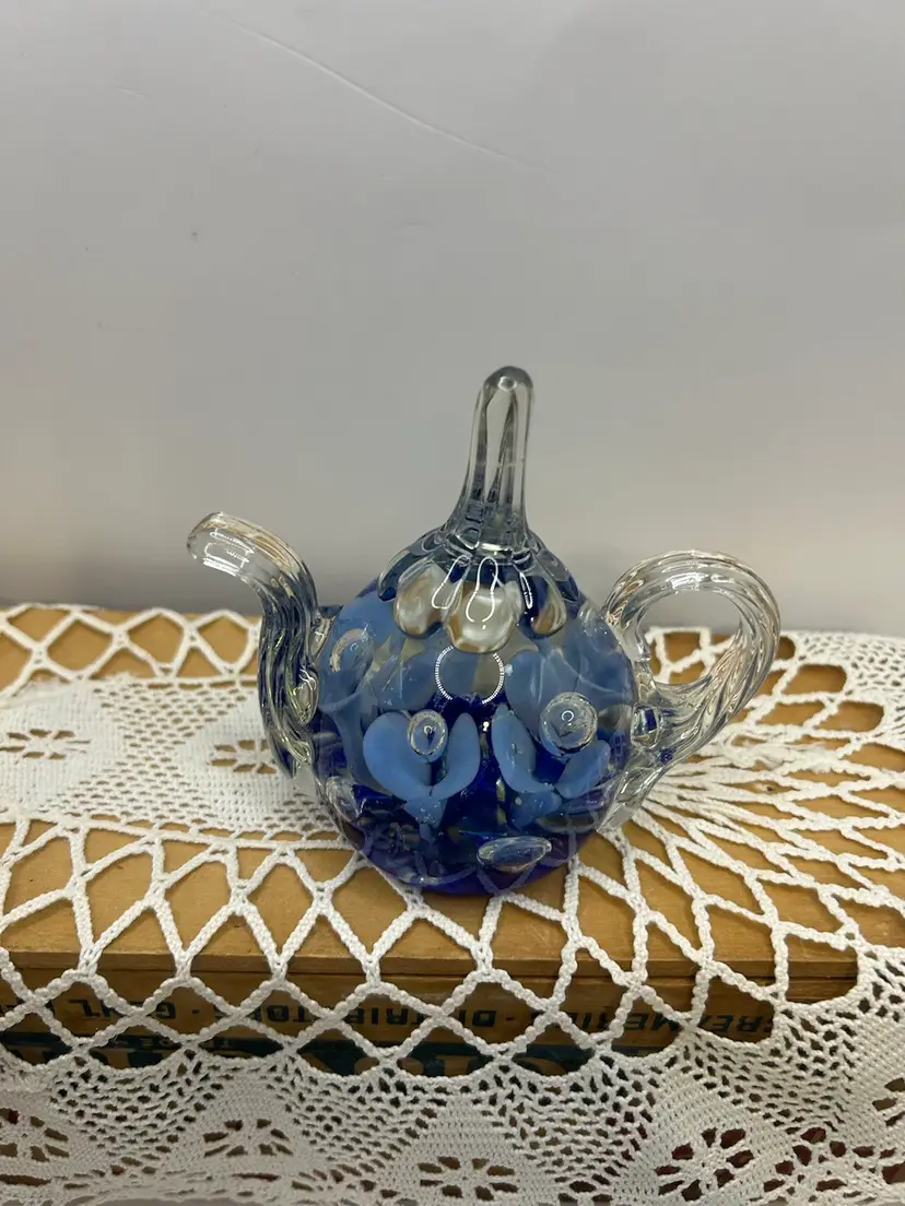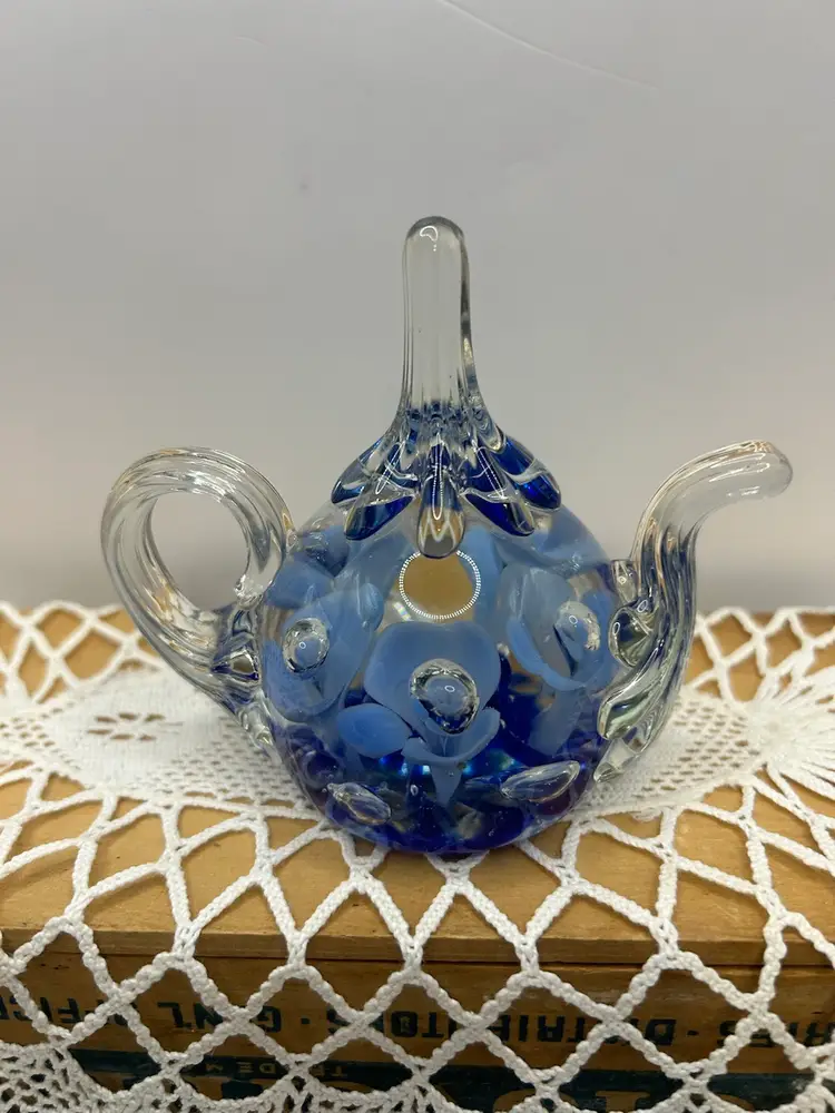 Blue Flower Art Glass Teapot Paperweight 3 3/4x4