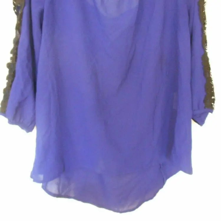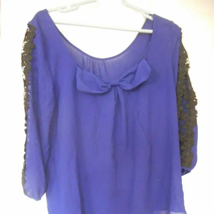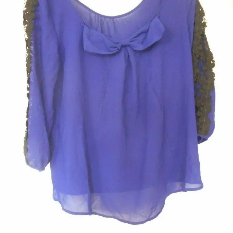 Blue Sheer Womens top Size L Lace sleeve accent bow on back blouse boat neck