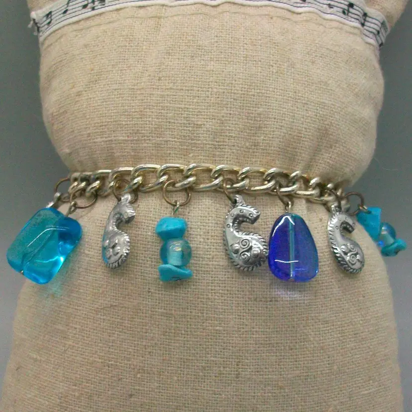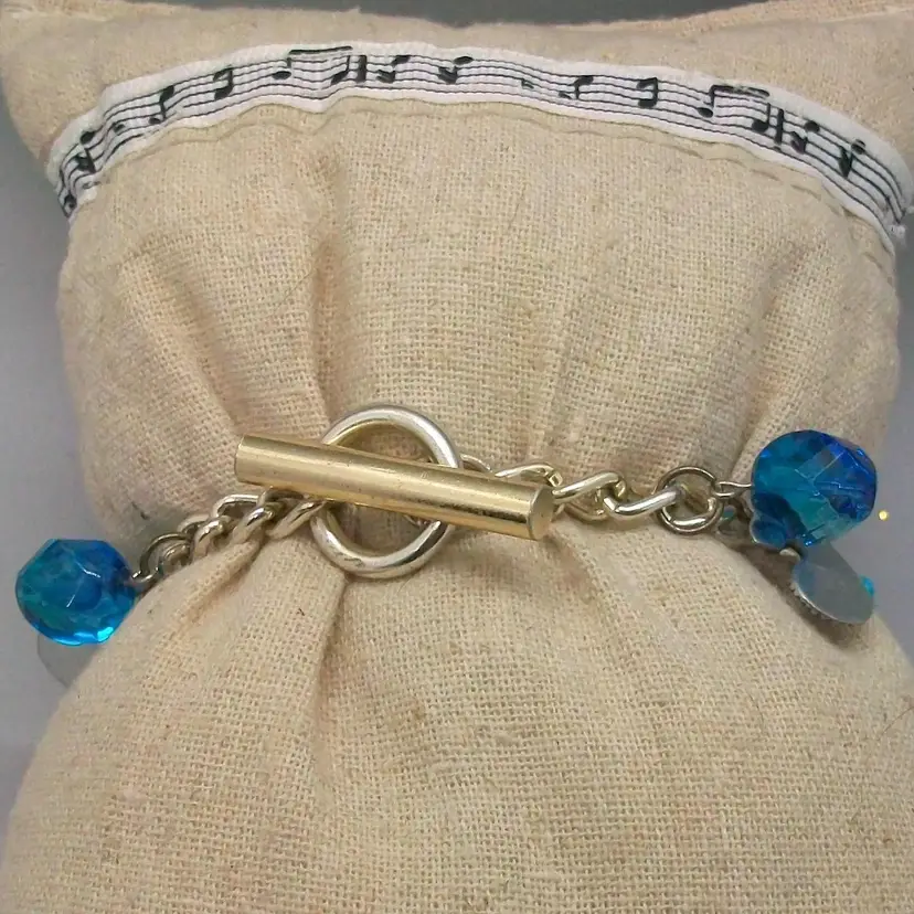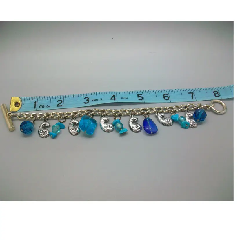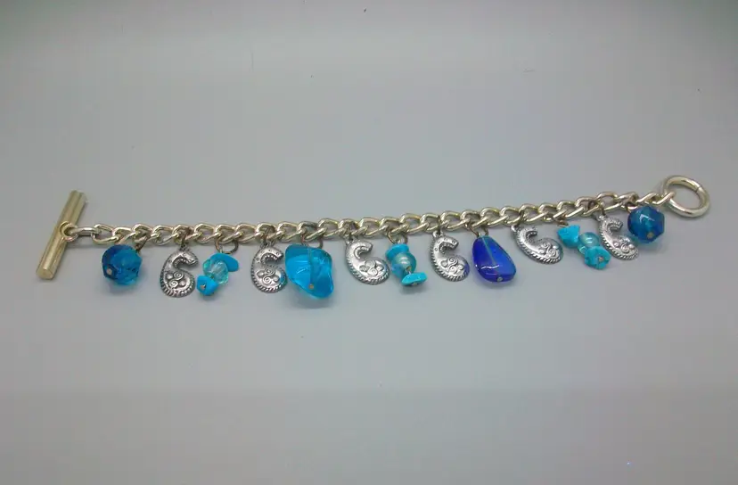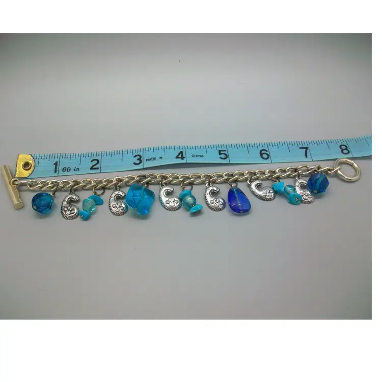 Chunky link style silver tone chain toggle closure blue, turquoise bead dangles silver tone paisley shape dangle charms 7.5" to 8"