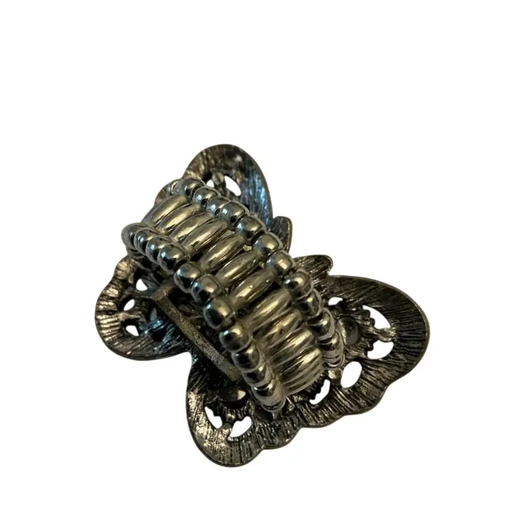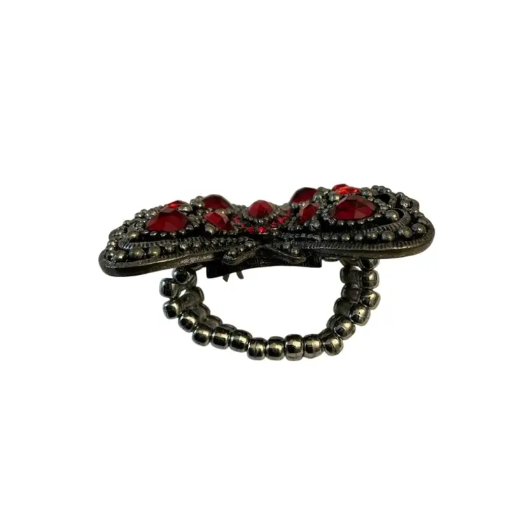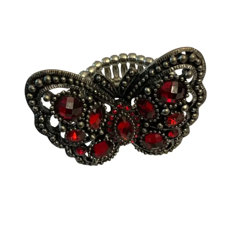 Butterfly Adjustable Ring Silver Tone With Red Rhinestones 1 7/8” X 1 1/2”