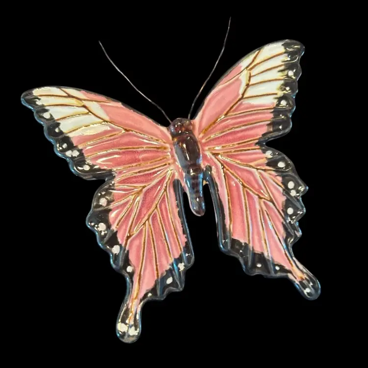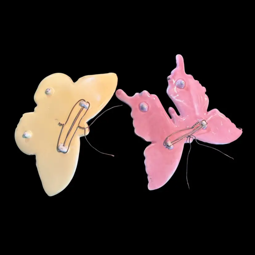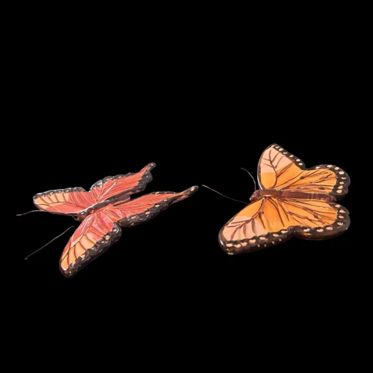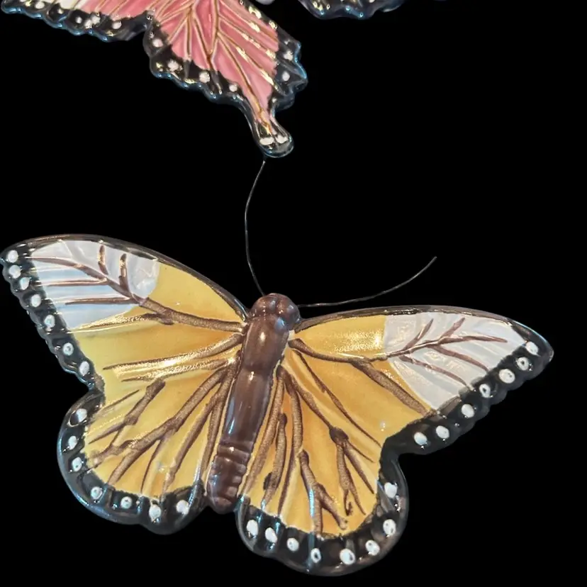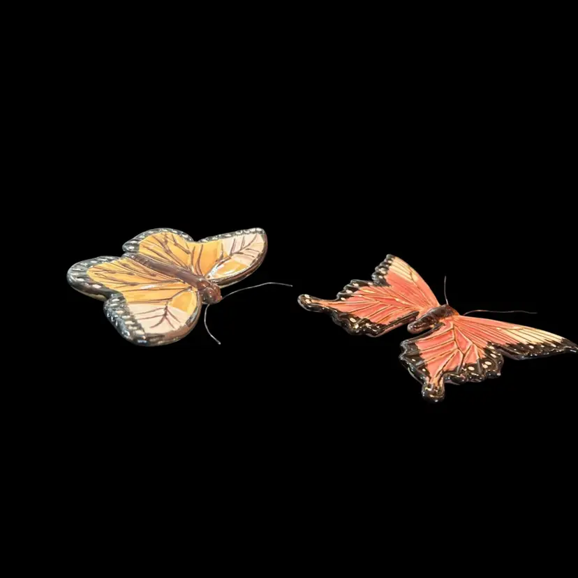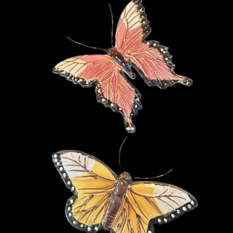 This pair of butterfly decorative items are in mint condition. The pinkish one measures approximately 4 1/2” wide and tall and the yellowish one measures approximately 6” wide and 3” tall. (BSA2)