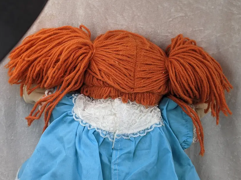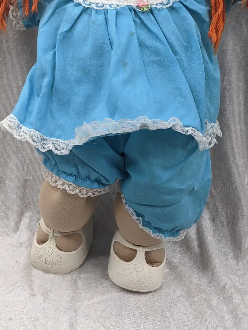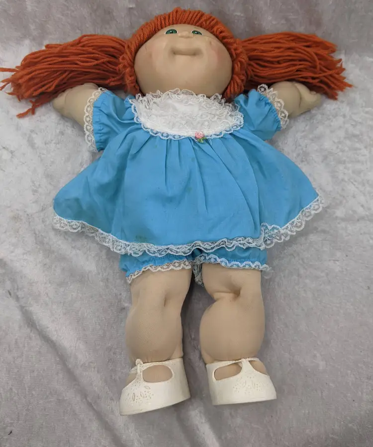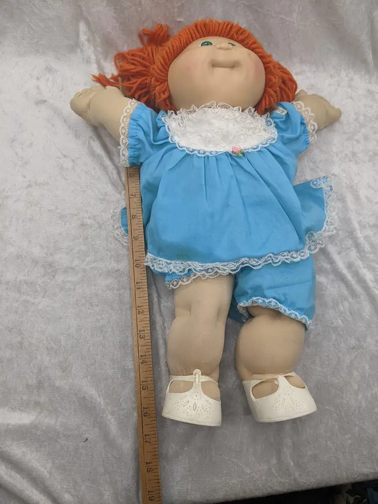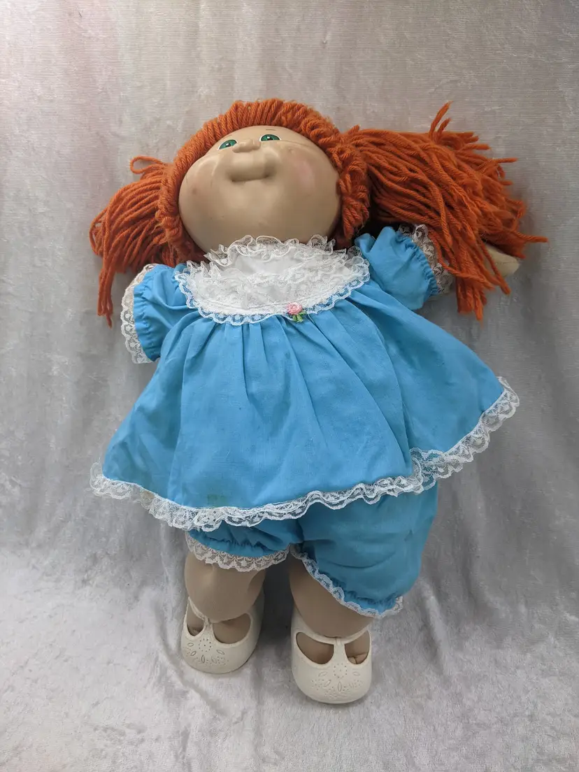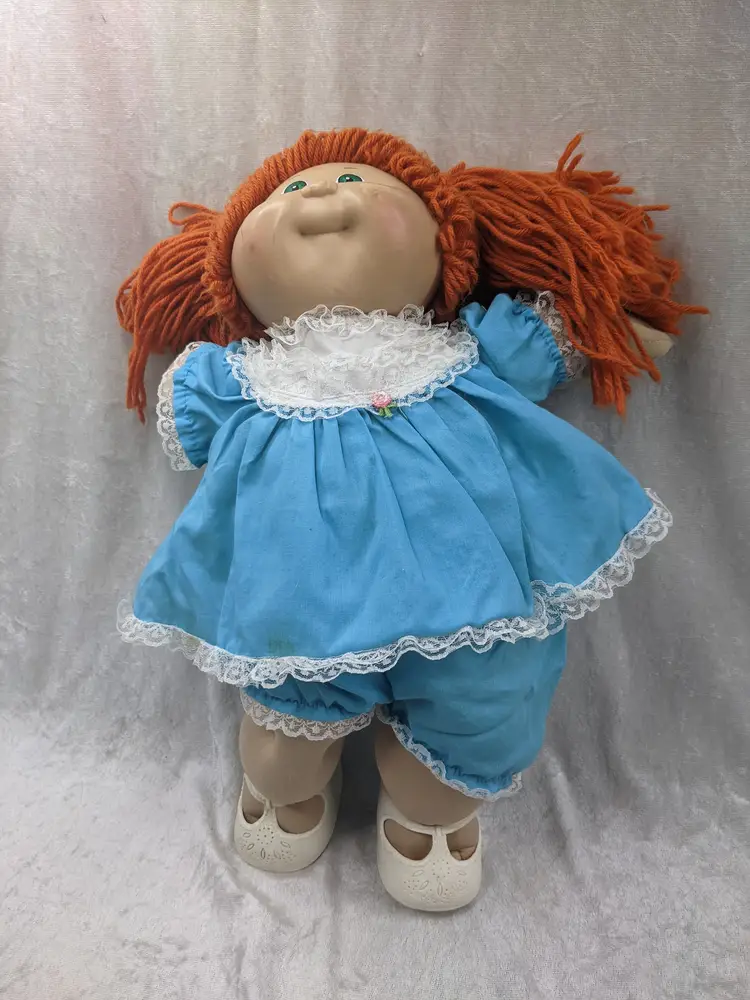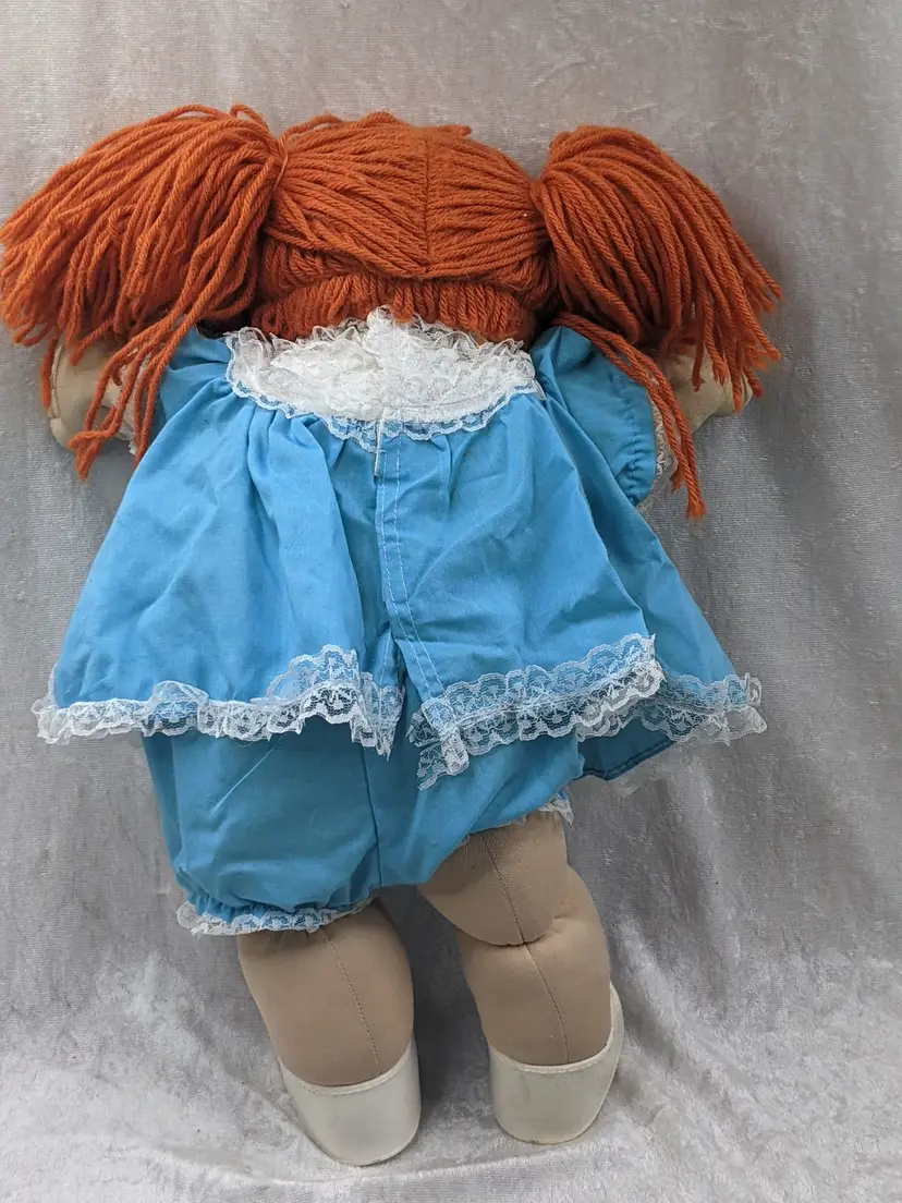 Cabbage Patch Kids Girl Doll Fully Dressed Original Clothes Soft Body Vintage red orange Hair Long in pig tails. 16ins 1980s Blue dress Panties Shoes 1982 LONG red yarn hair with Blue eyes. She is all dress up in her 80s style top and pants. .She is 17in tall From the 80s . .Very good condition Clean with no damage. The blue dress pant the elastic has lost its stretch, no weird smells. Please check the photos for details. Comes from a smoke free home. We do have pets