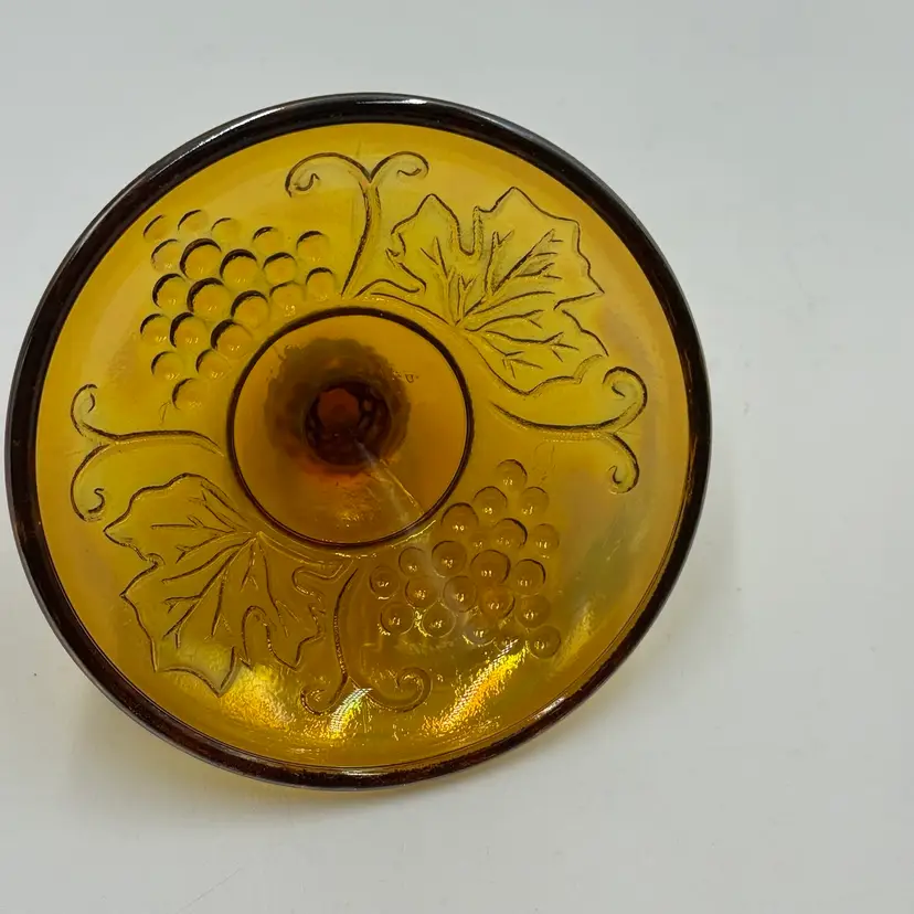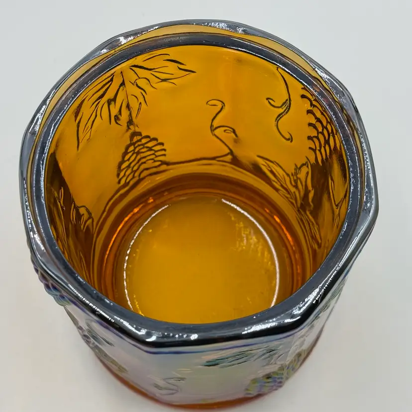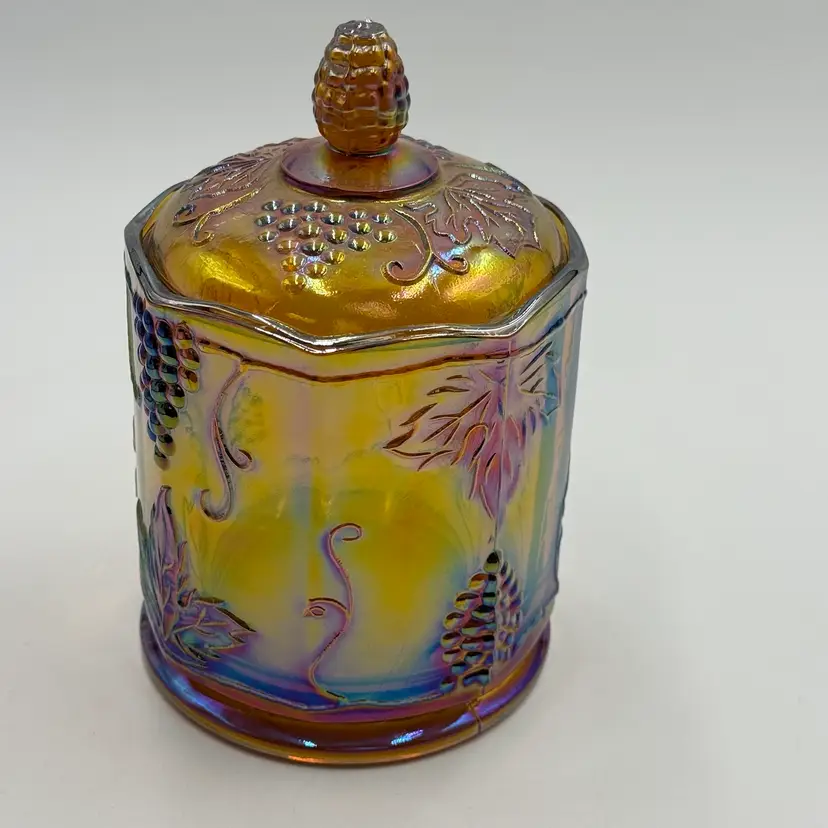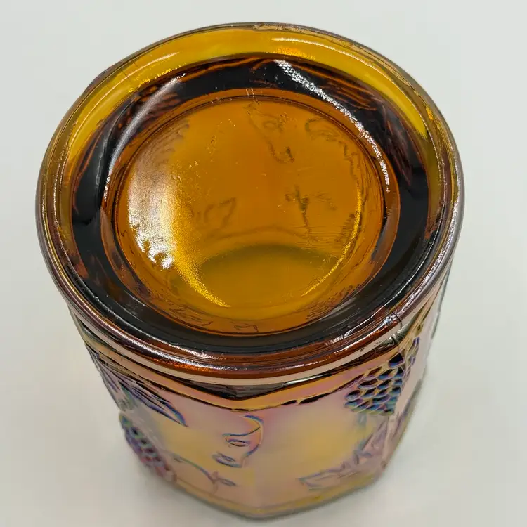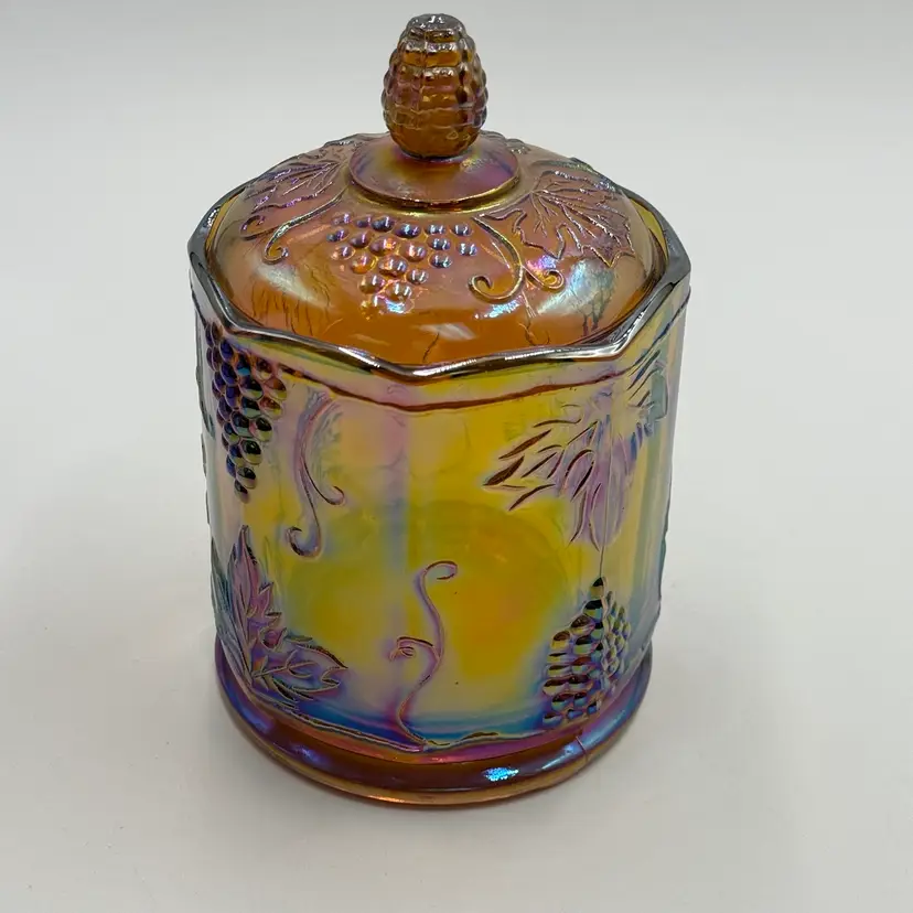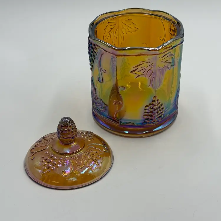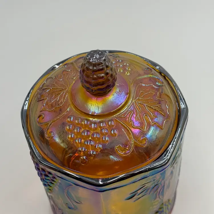 This iridescent amber carnival glass canister is a vintage piece with a grape and leaf theme. The biscuit jar stands at 7 inches in height and is 4 1/2 inches wide, making it a medium-sized container. It comes with a lid and is perfect for storing biscuits or other treats. In good condition, does not have any chips or cracks.