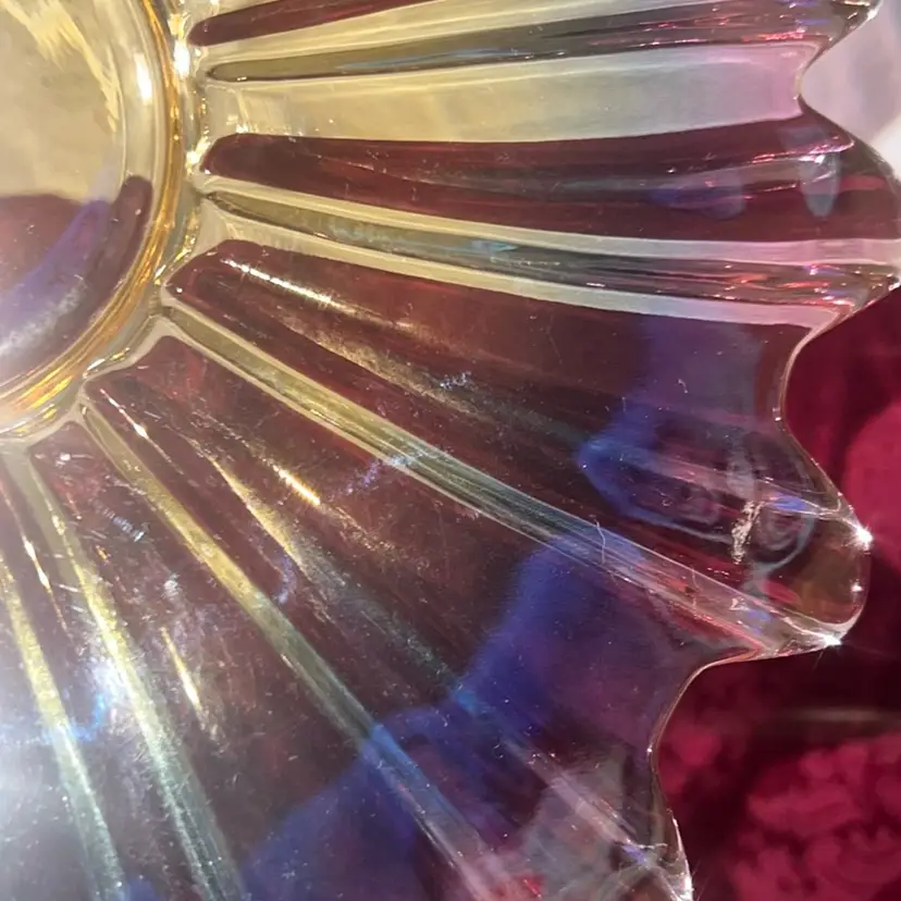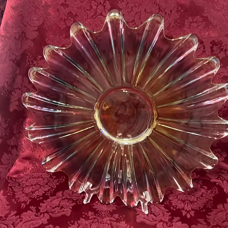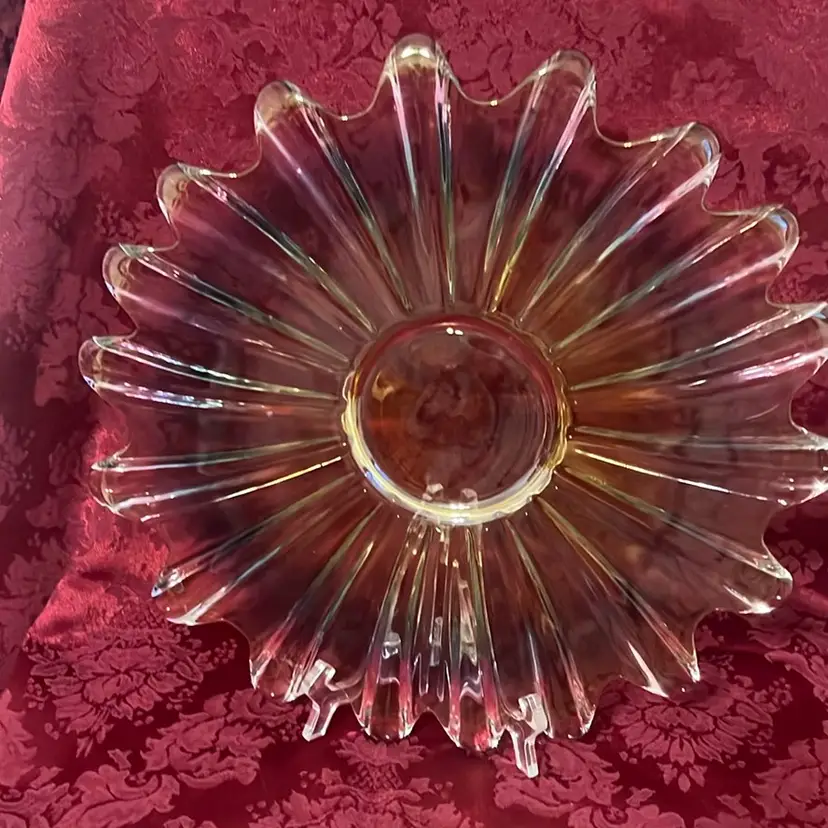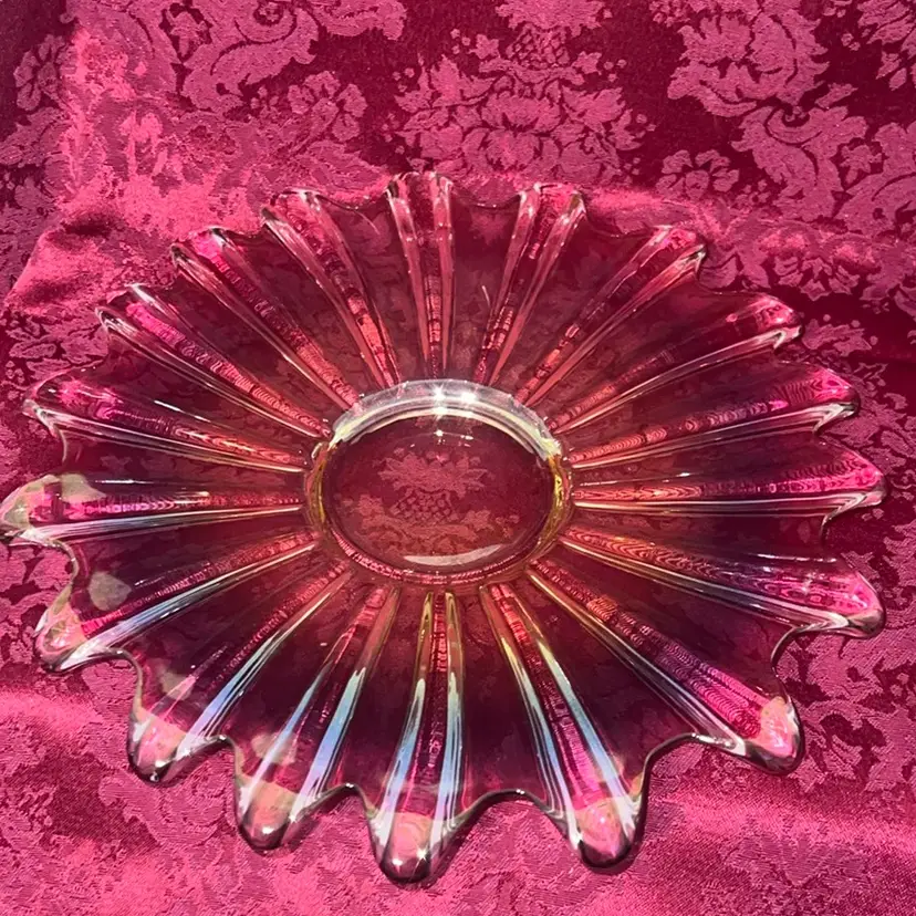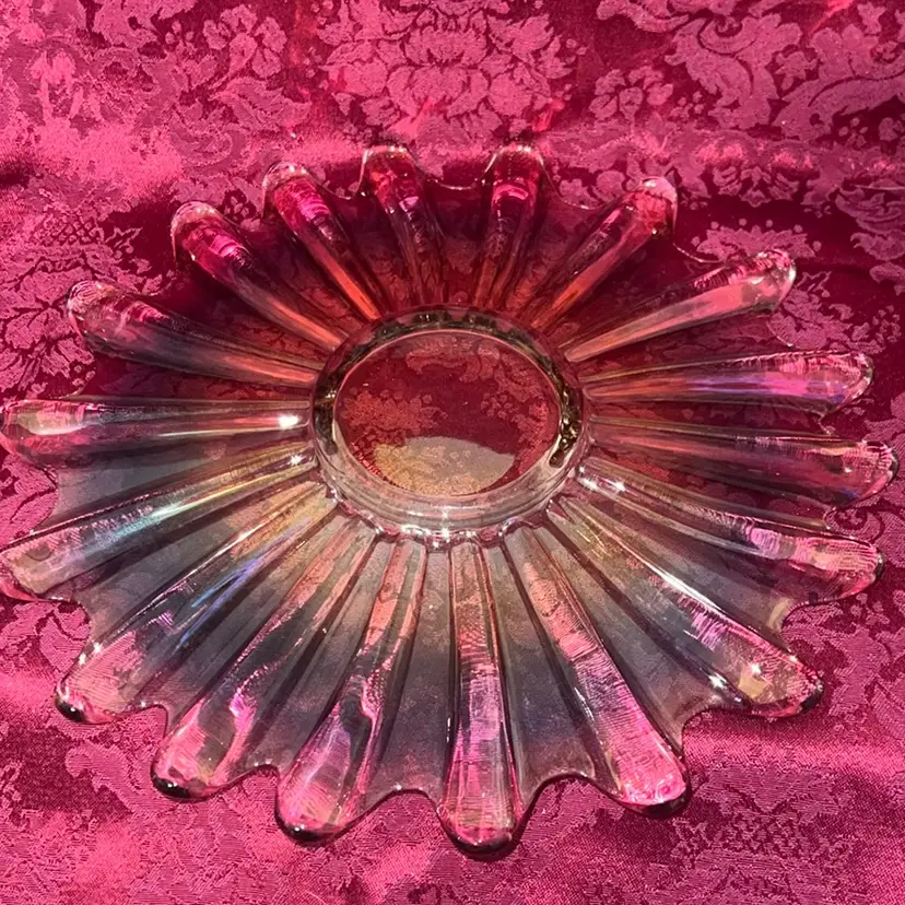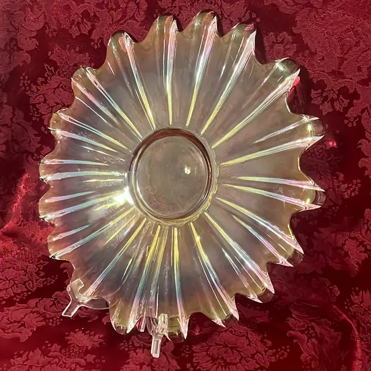 Vintage Federal Glass "Celestial Starburst" iridescent carnival glass bowl. The clear glass bowl features a ribbed and scalloped or ruffled edge with a starburst design in the center. It was produced in the United States, starting around the 1960s. The iridescent finish gives the glass a luminous quality with rainbow colors that change when seen from different angles.