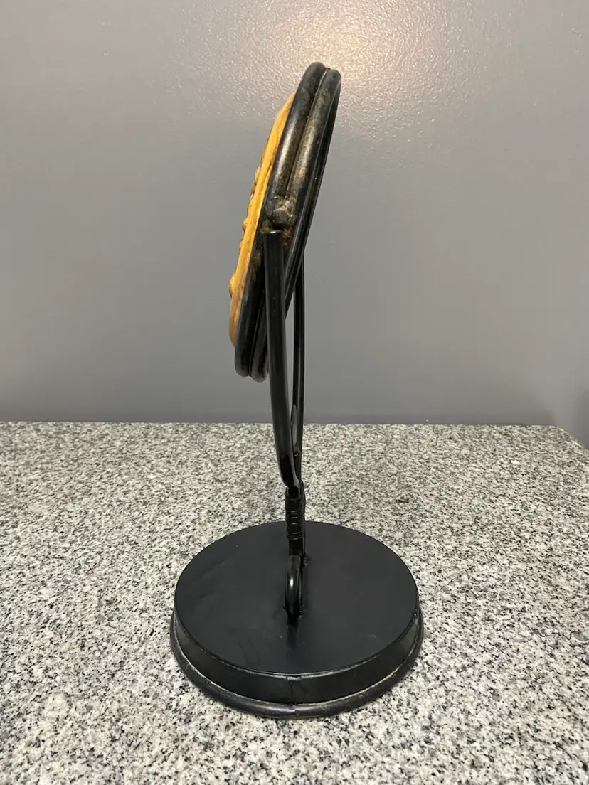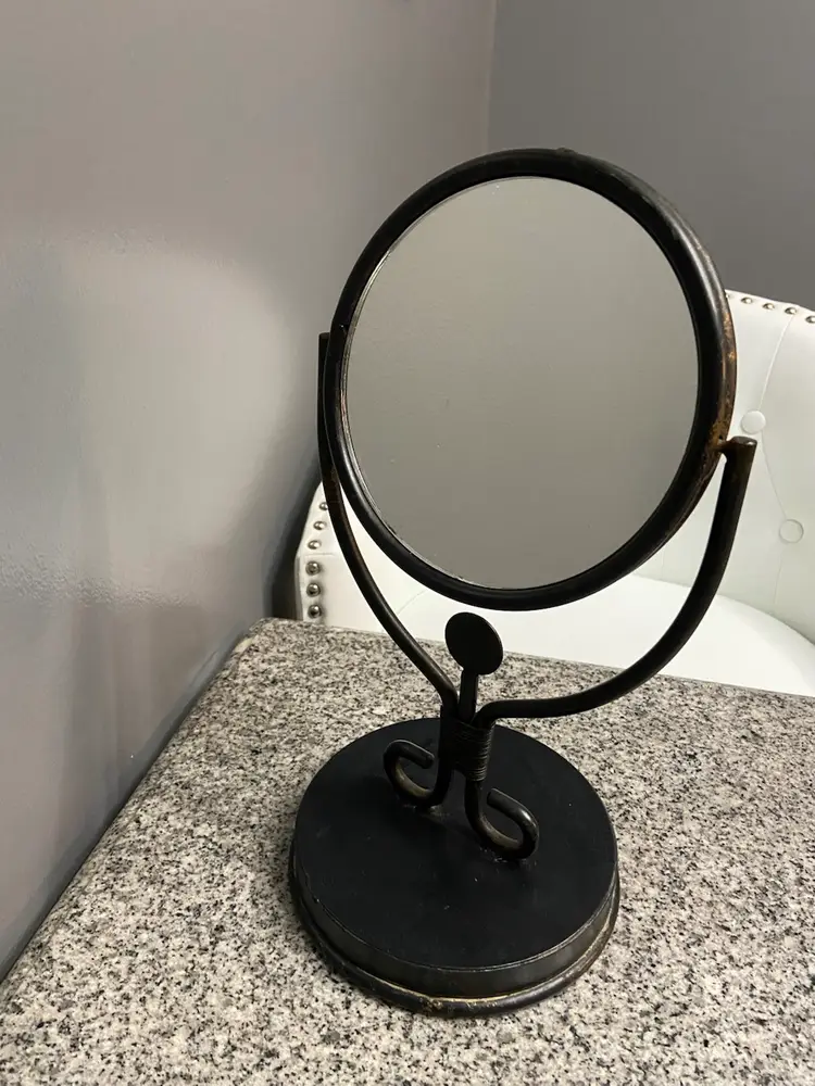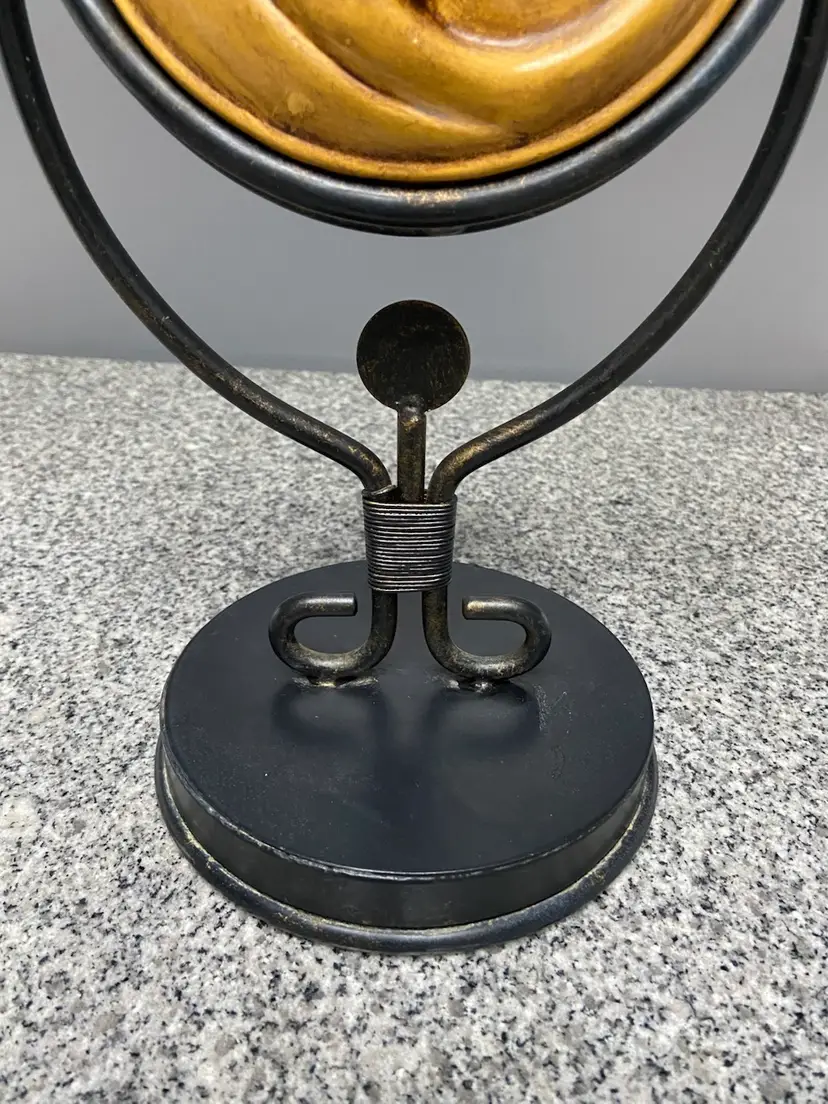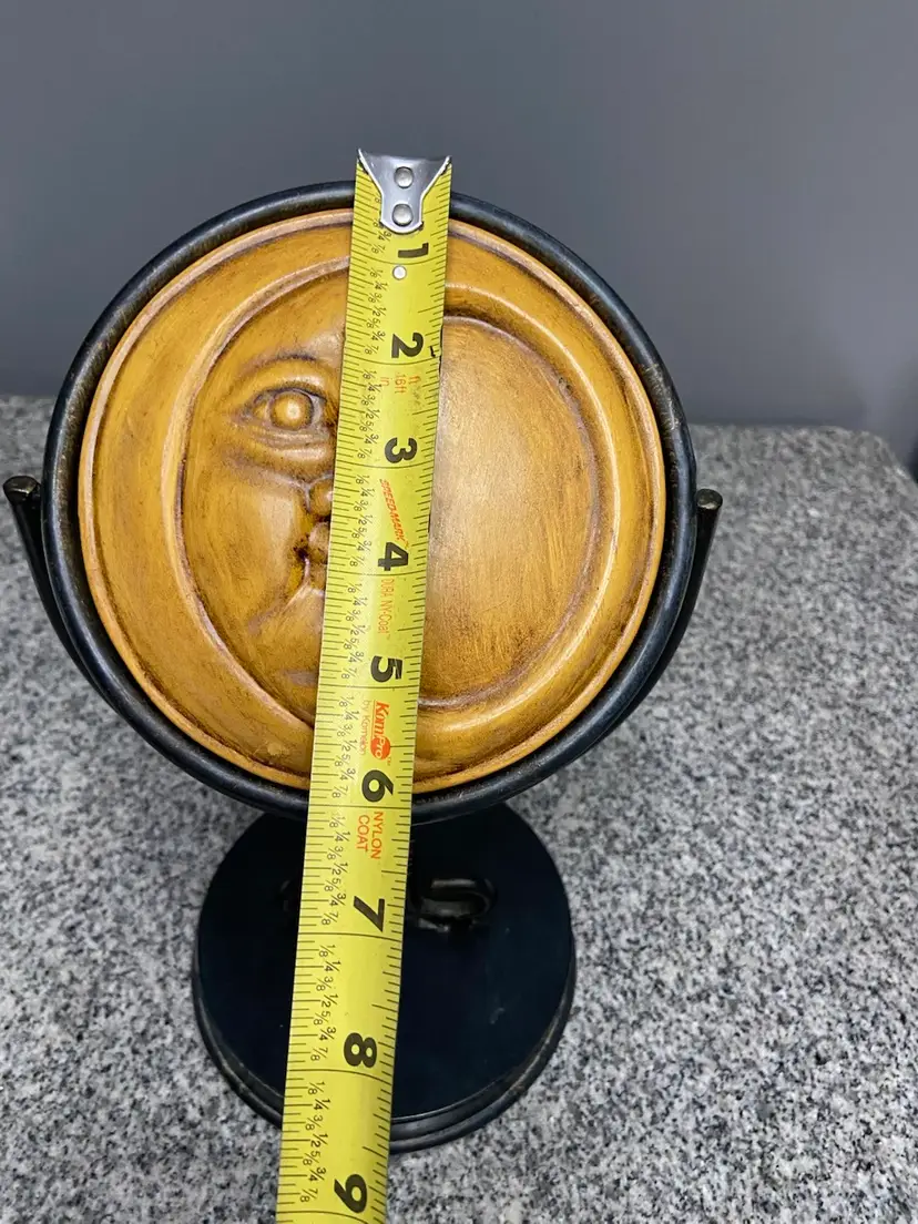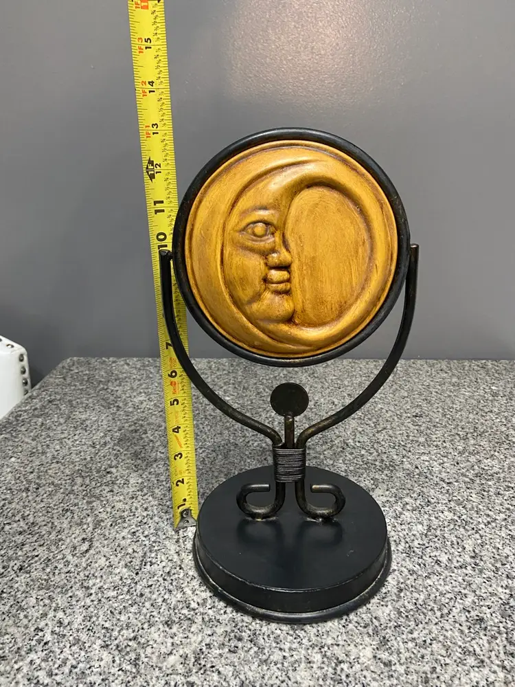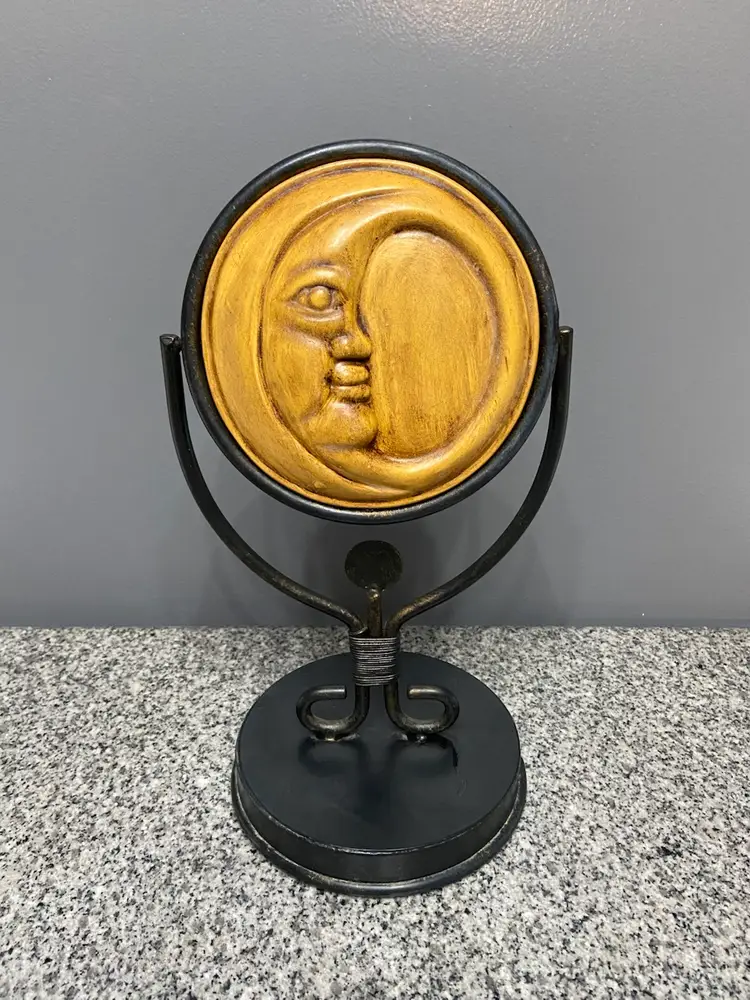 This Mirror is a charming addition to any room, featuring a faux wood moon and burnished bronze accents that add a touch of whimsy and magic to your decor. The mirror has a freestanding design and a 3D effect, making it a unique accent piece for your entryway, bathroom, bedroom, living room, or sunroom. Its brown caramel color and celestial theme make it a perfect choice for fans of witchy, fairycore, or whimsical aesthetics. The metal frame and spin feature add a touch of functionality to this beautiful and enchanting mirror.