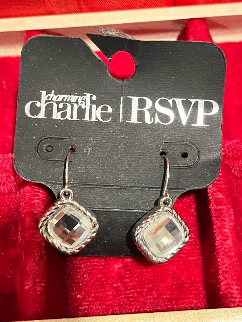 Charming Charlie RSVP silver-tone drop earrings with clear faceted cushion-cut stones and a rope-twist border