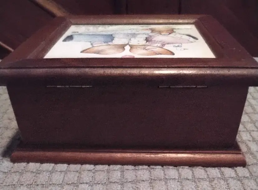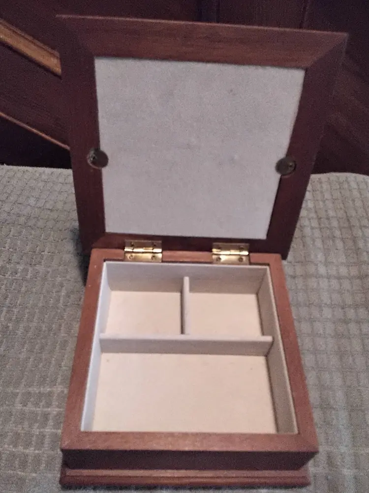 Childs Wooden Jewelry Box/Organizer. Felt like material inside. 3 small compartments. Made for small jewelry. It is 6 inches long and 6 inches wide. 2.9 inches tall. It is in good condition with a few small scratch marks. Photos are part of the description.