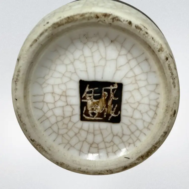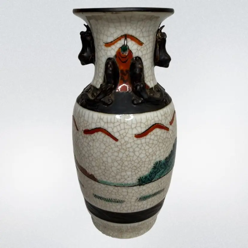 Small Chinese porcelain vase depicting warrior fighting scene. 6” x 2.5”. No chips or cracks.