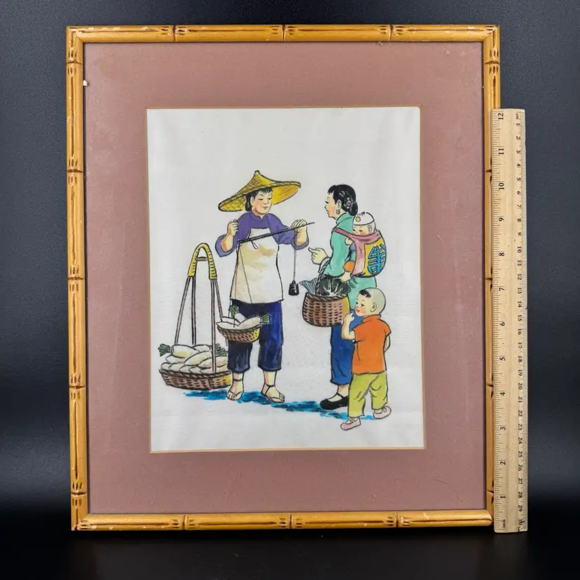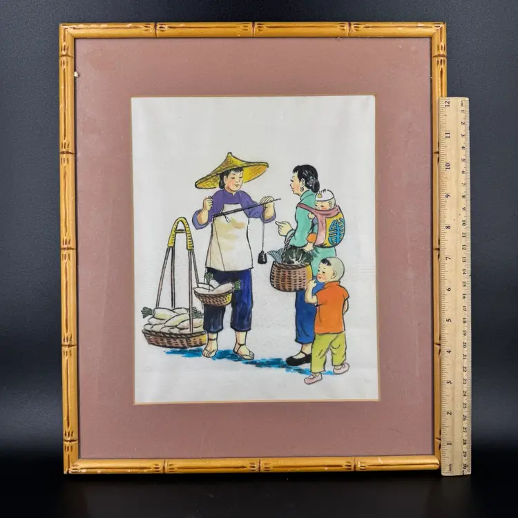 This Chinese Painting On Silk Family Shopping is approximately 14” in height. The frame has some dings and scratches on it. On the back of the frame it does have some damage to the paper which can be seen in the photos. Also it is marked in the back of the frame.