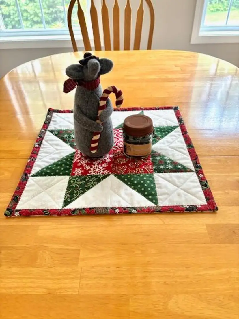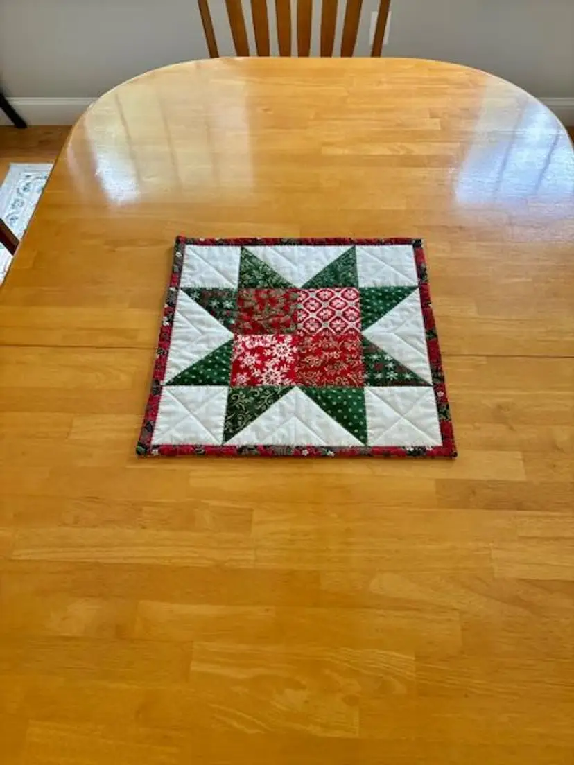 This scrappy star table topper is the perfect centerpiece for a smaller table and can also be used as a tree skirt for a small table-top Christmas tree.