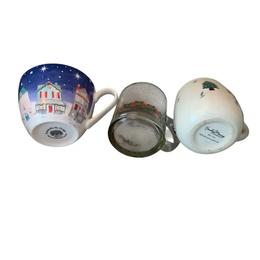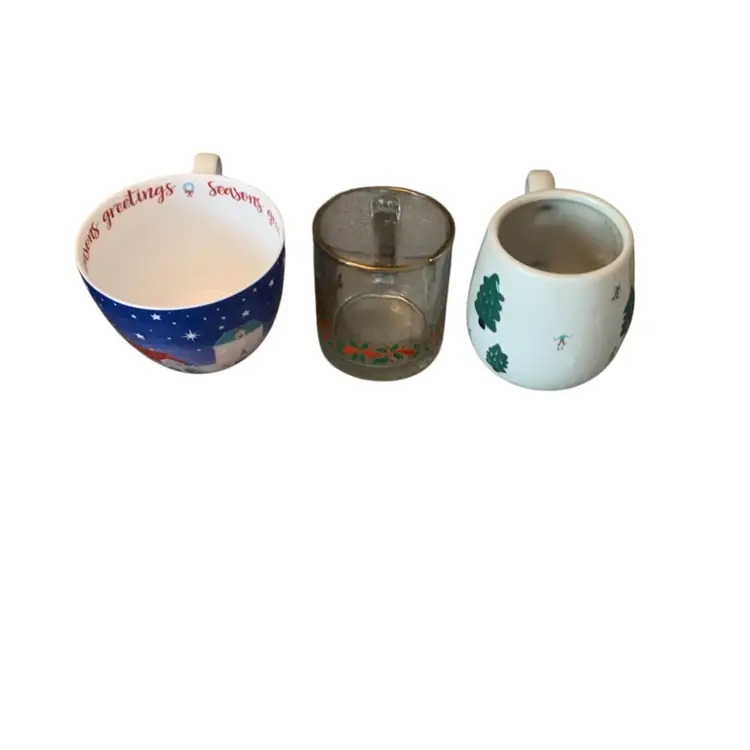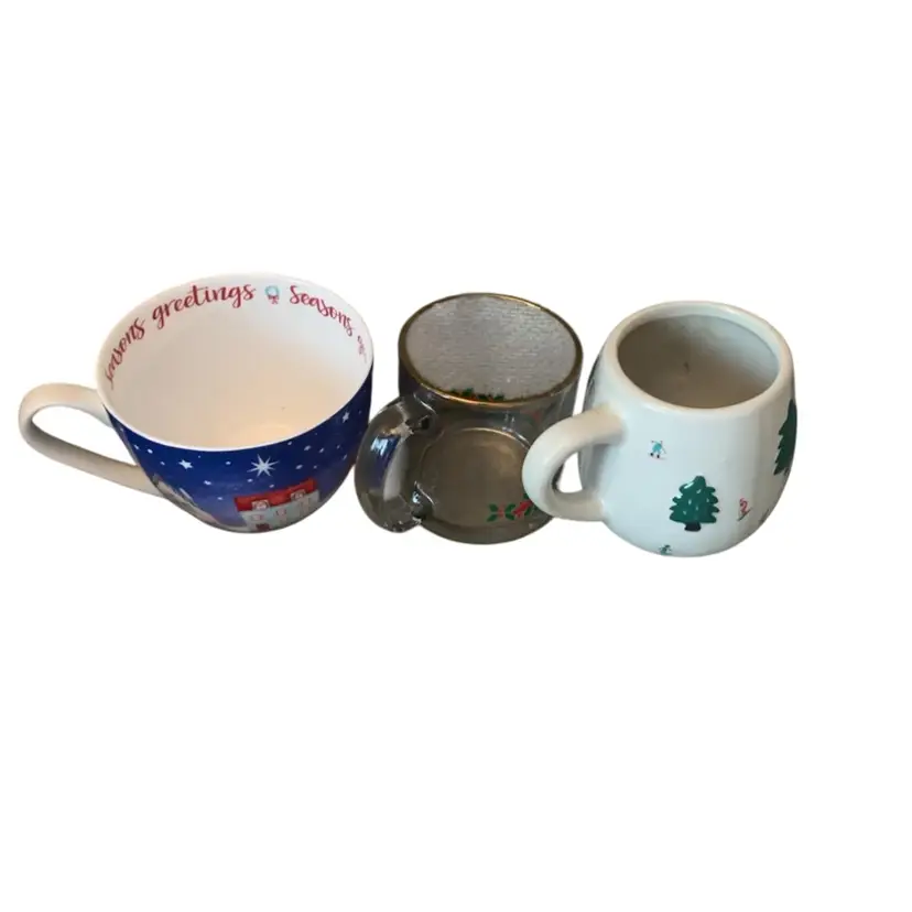 No chips or cracks. Larger mug 5 7/8 X 4 3/4 x 3 5/8 inches, clear mug 4 1/2 X 3 3/8 X 3 5/8 inches, tree-skier mug, 5 X 4 X 4 inches.